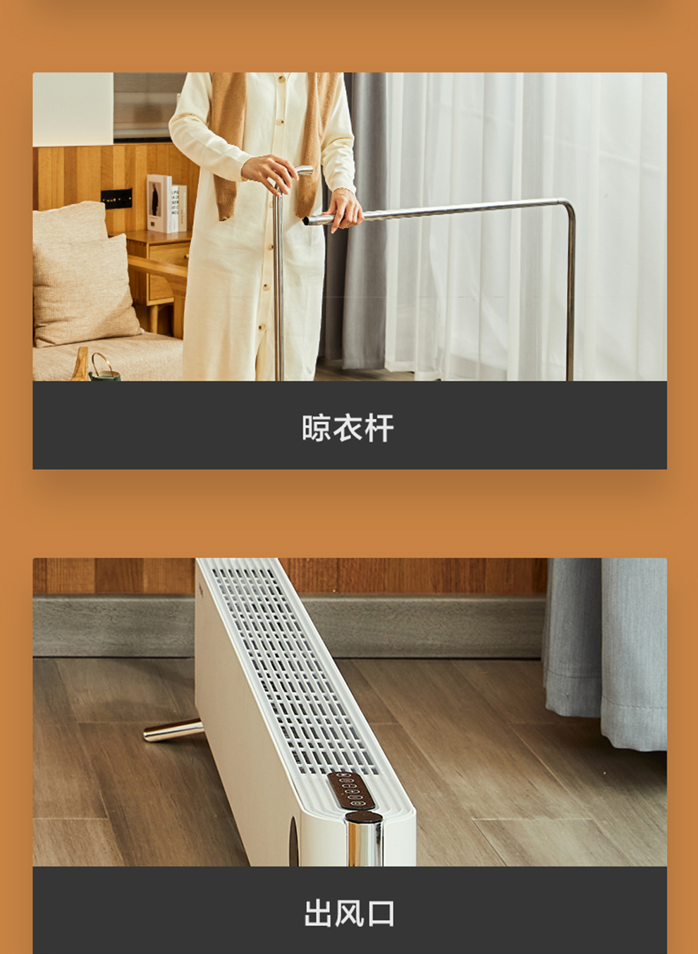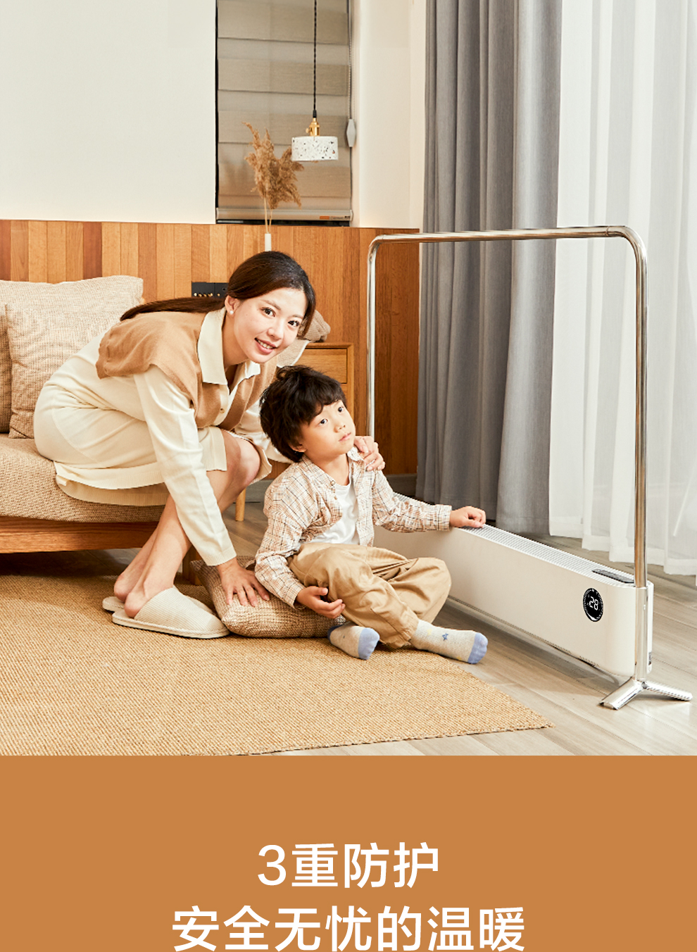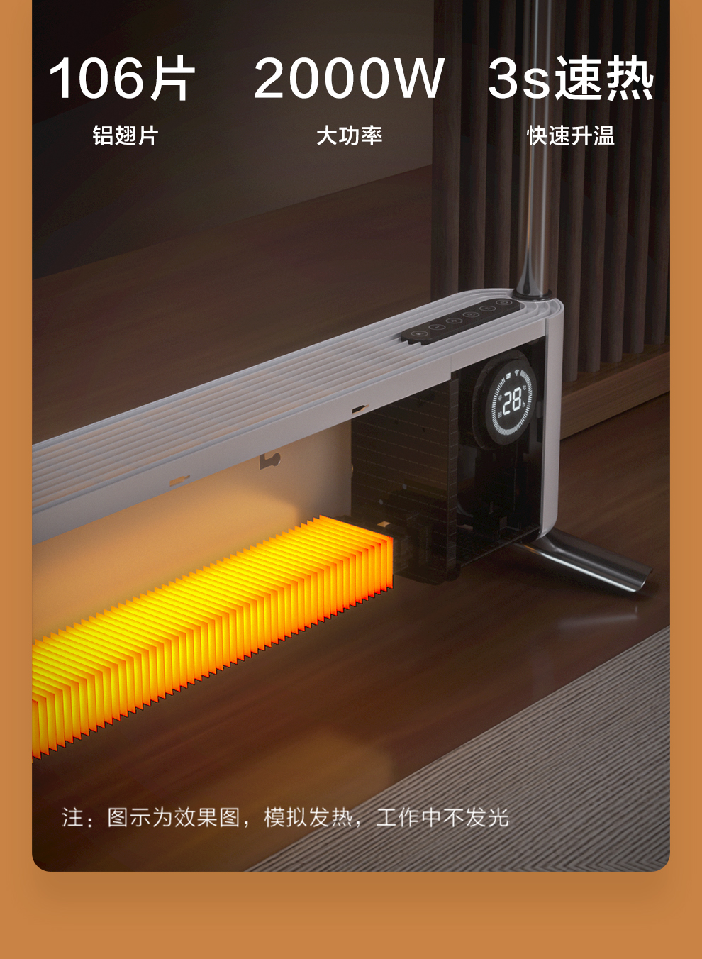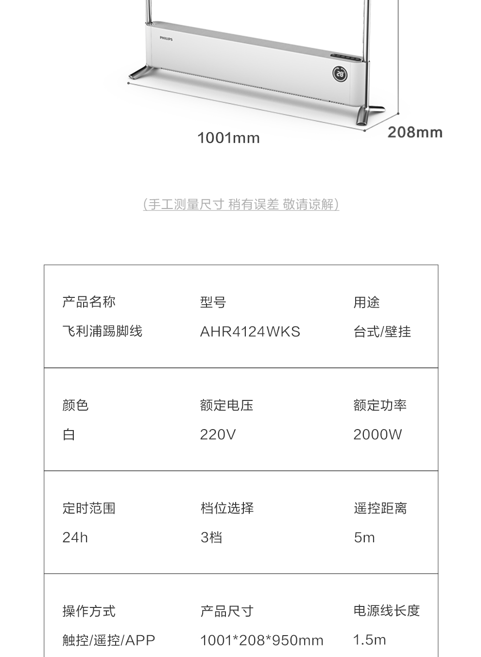 | 包装清单 | 踢脚线电暖器*1、遥控器*1、说明书*1、底脚*2、膨胀螺钉*2、壁挂螺钉*2、底脚元宝螺钉*2、烘衣架*1 |
