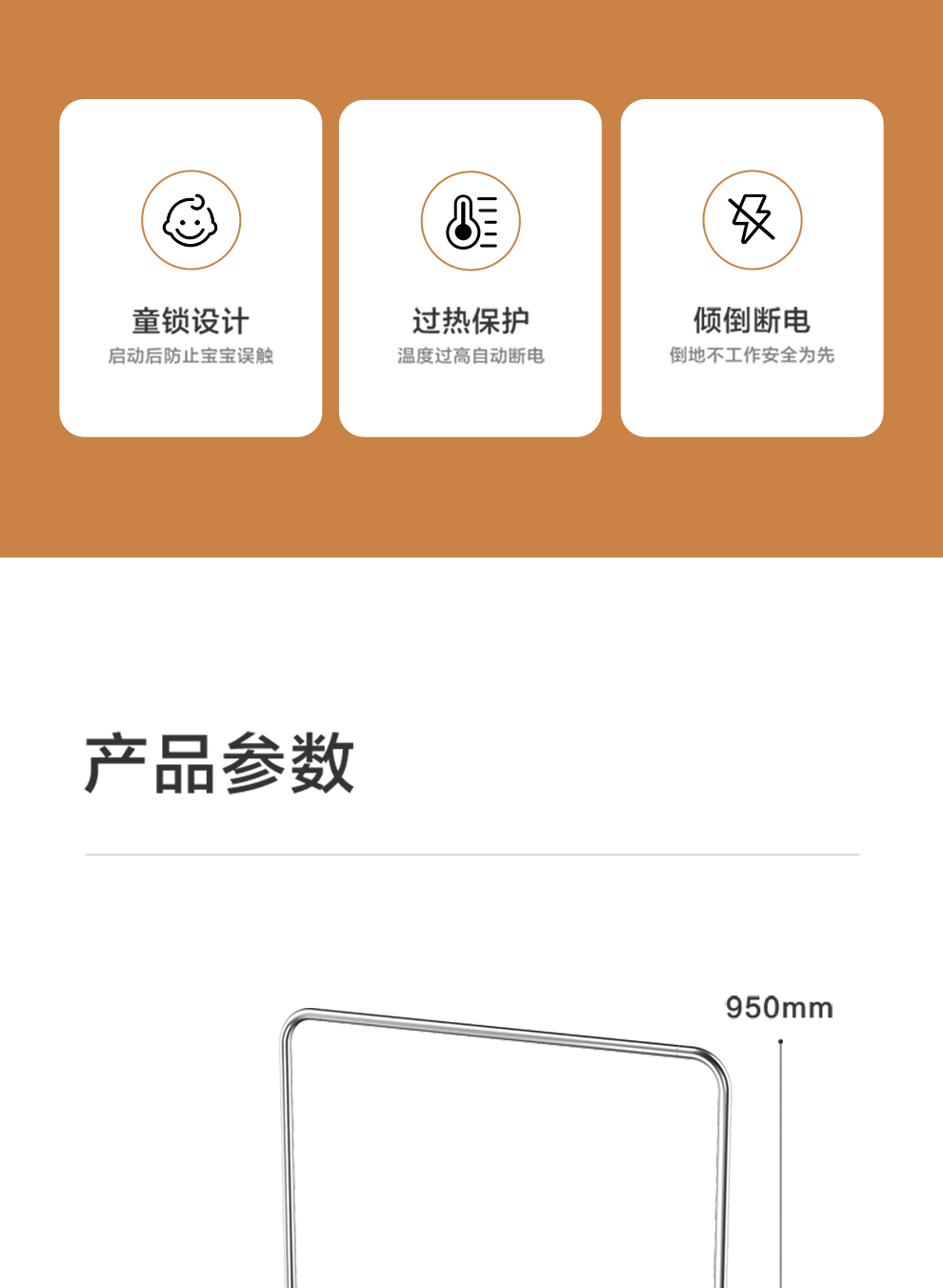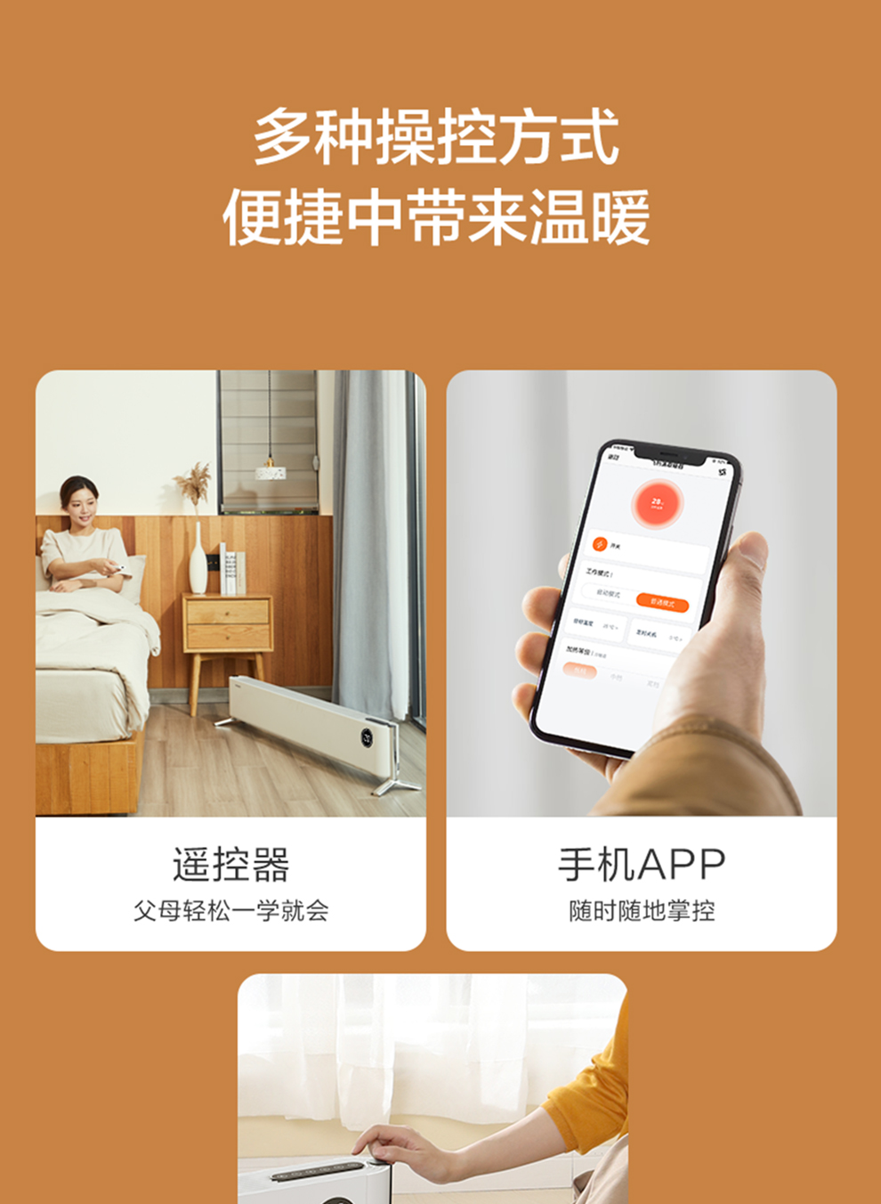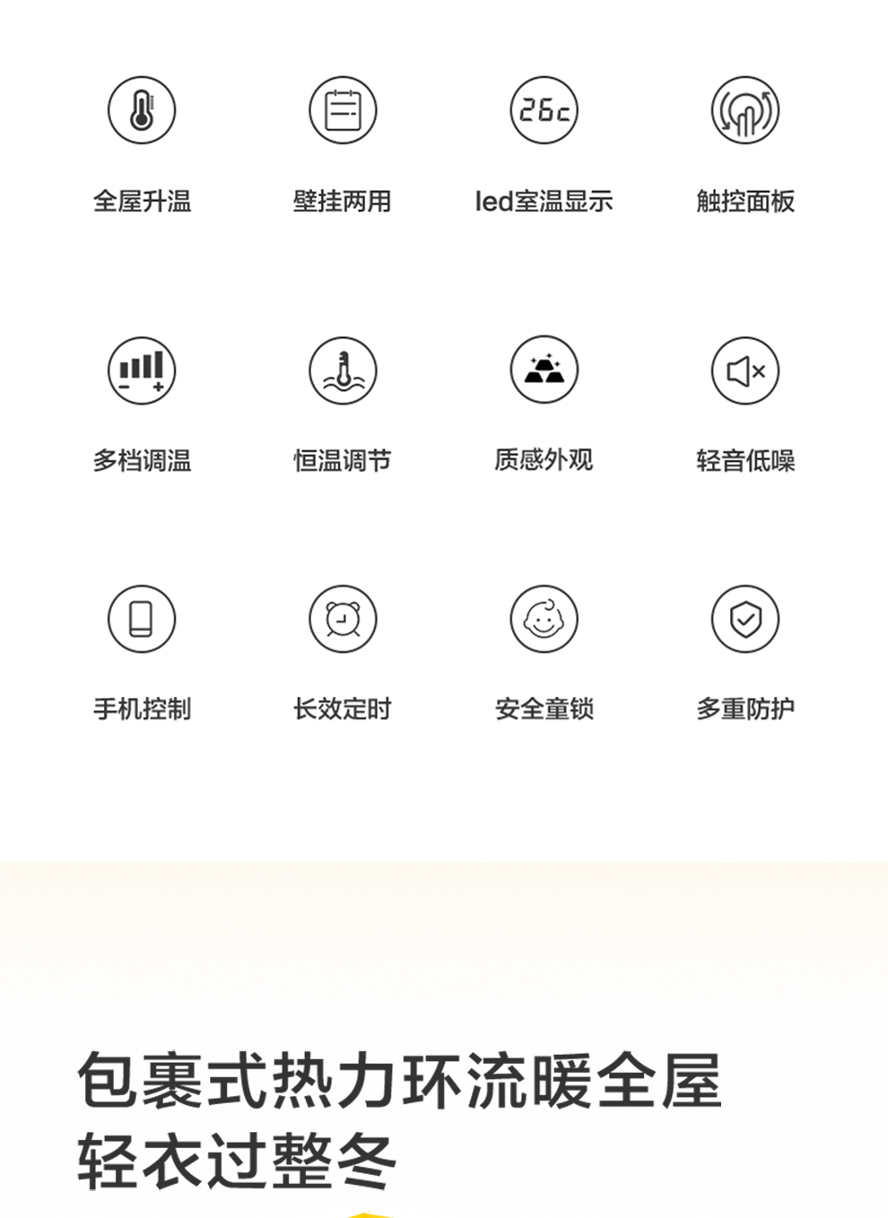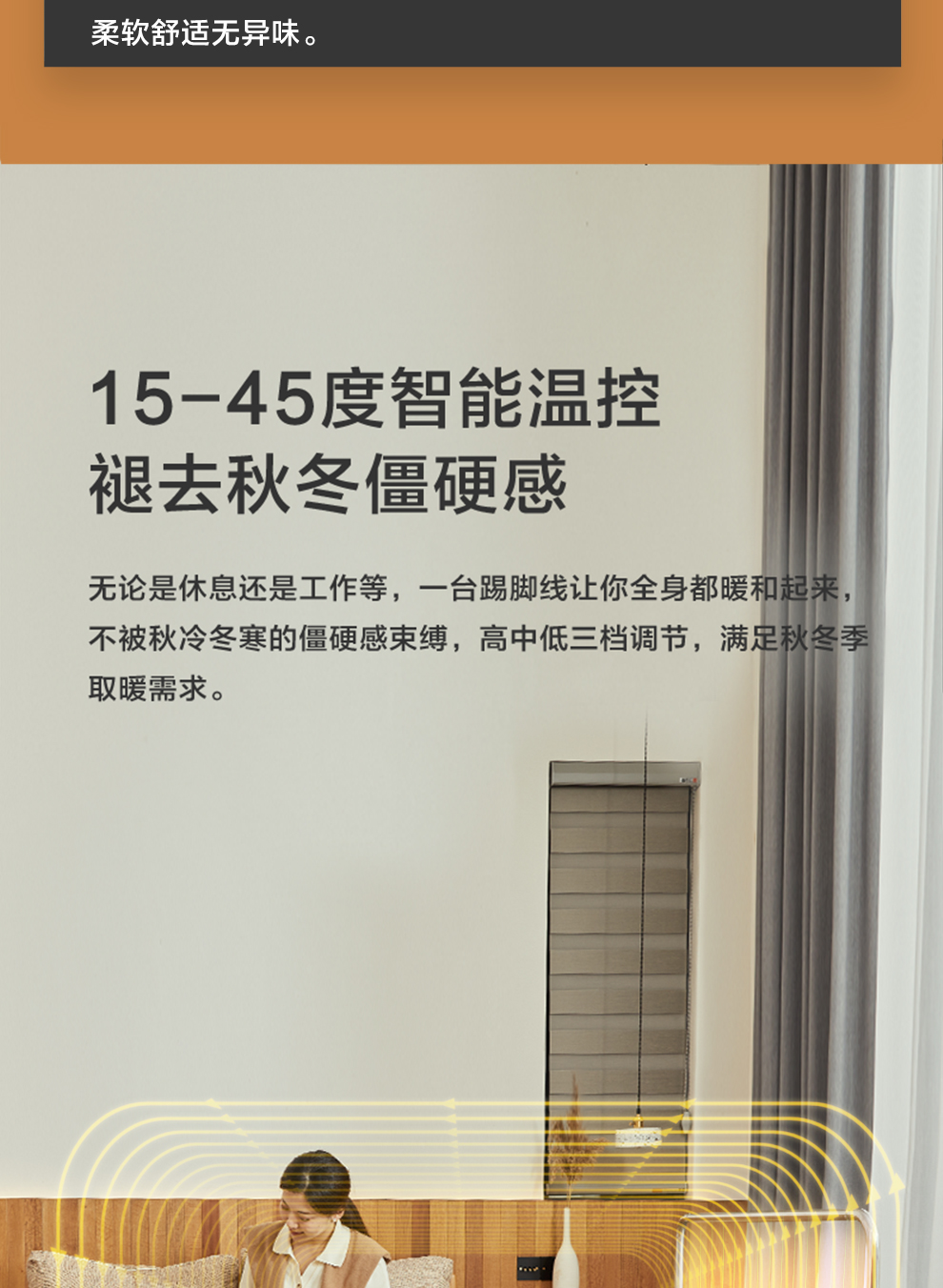 | 包装清单 | 踢脚线电暖器*1、遥控器*1、说明书*1、底脚*2、膨胀螺钉*2、壁挂螺钉*2、底脚元宝螺钉*2、烘衣架*1 |