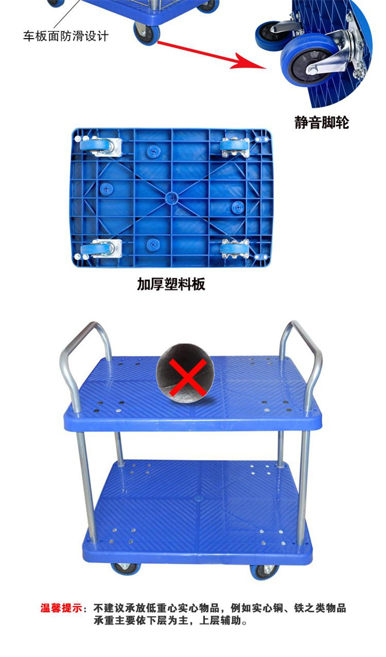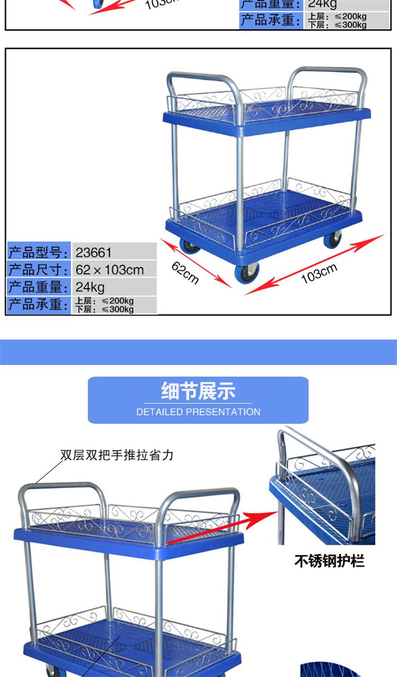 供应商:史泰博 品牌:安赛瑞 产地:中国 重量:14.500KG 销售单位:辆 包装清单:双层平板手推车*1