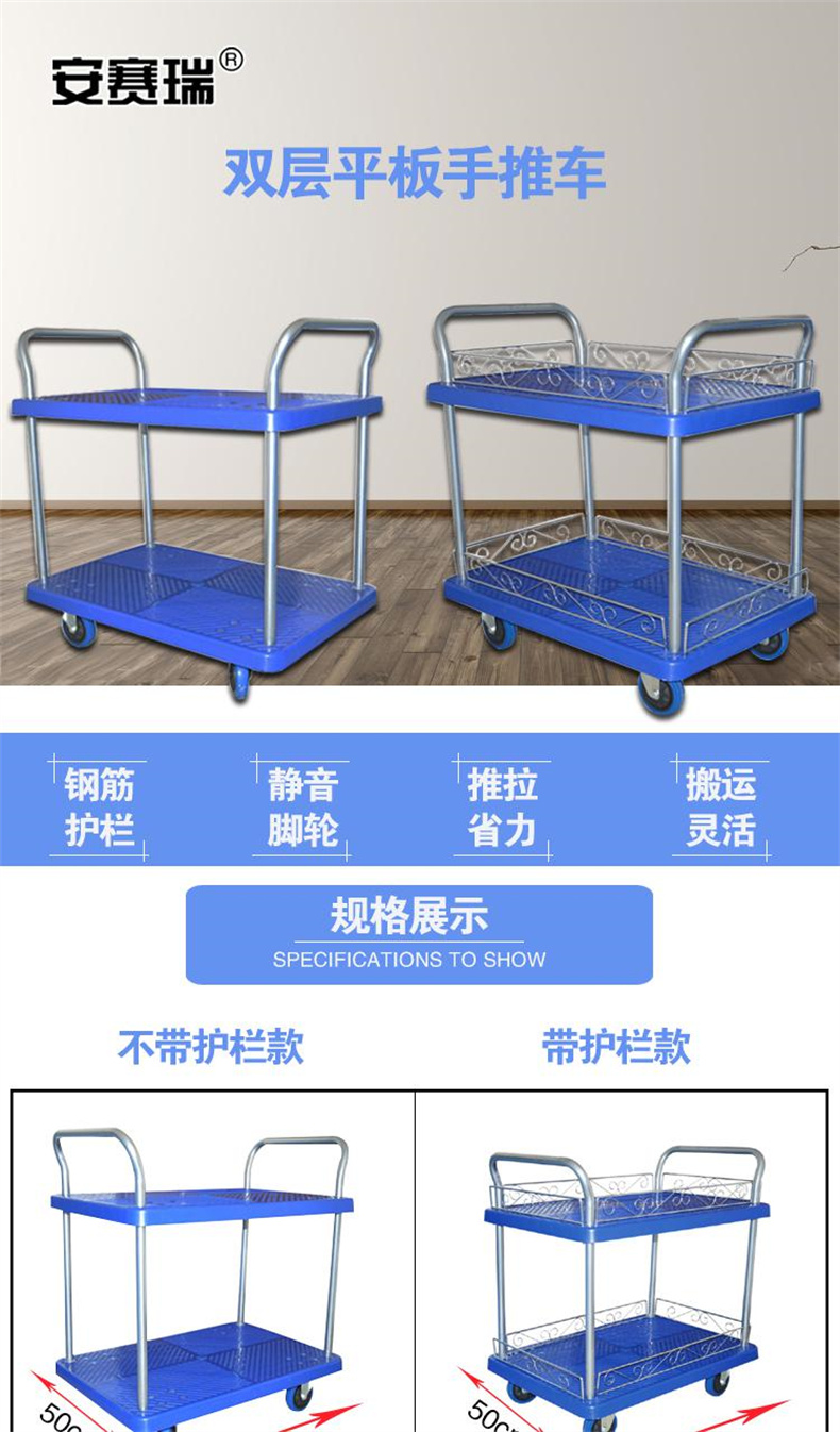 安赛瑞 23657 双层平板手推车 50×70cm 带护栏 承重150kg按(辆)销售   收藏