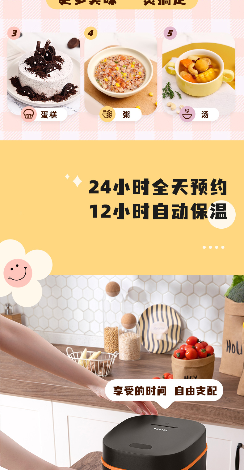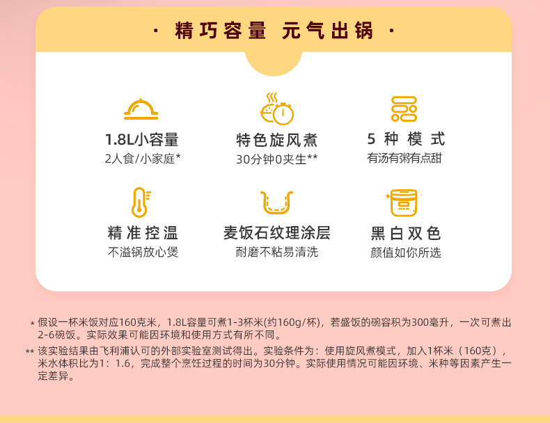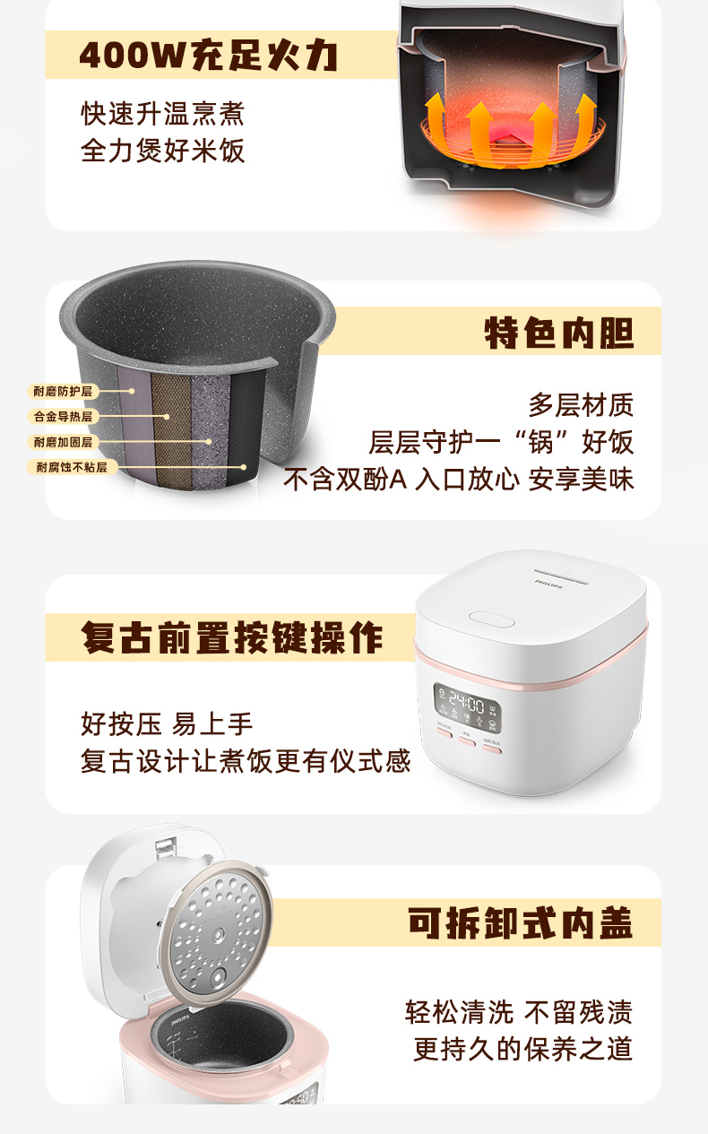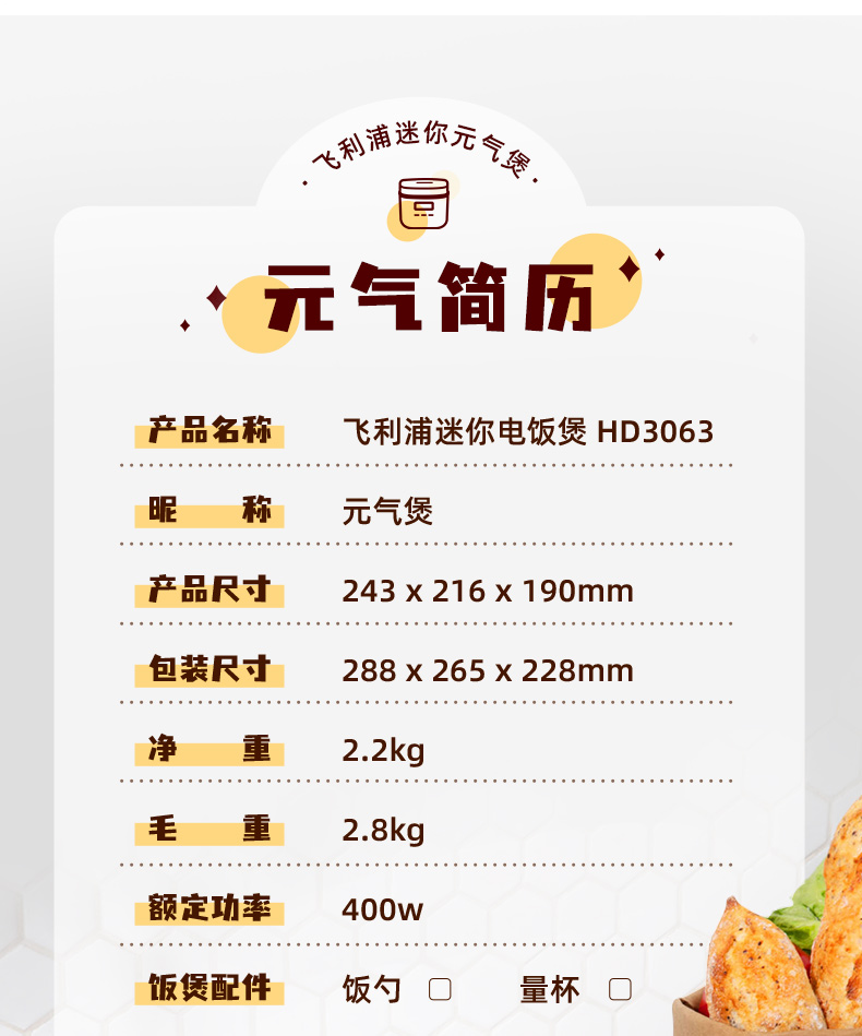 | 包装清单 | 电饭煲*1、产品保用卡*1、用户手册*1、配件(量杯*1, 饭勺*1,电源线*1) |