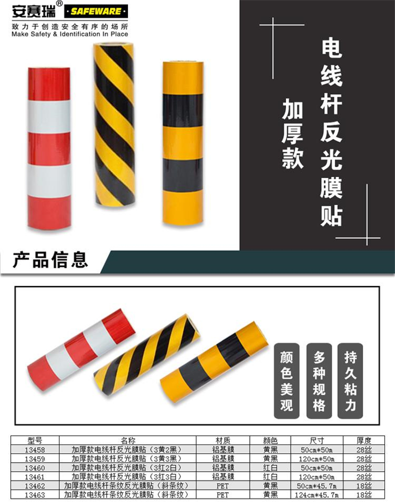• 安赛瑞 13460 加厚款电线杆防撞反光贴膜 (3红2白) 50cm×50m 厚28μm 铝基膜按(张)销售