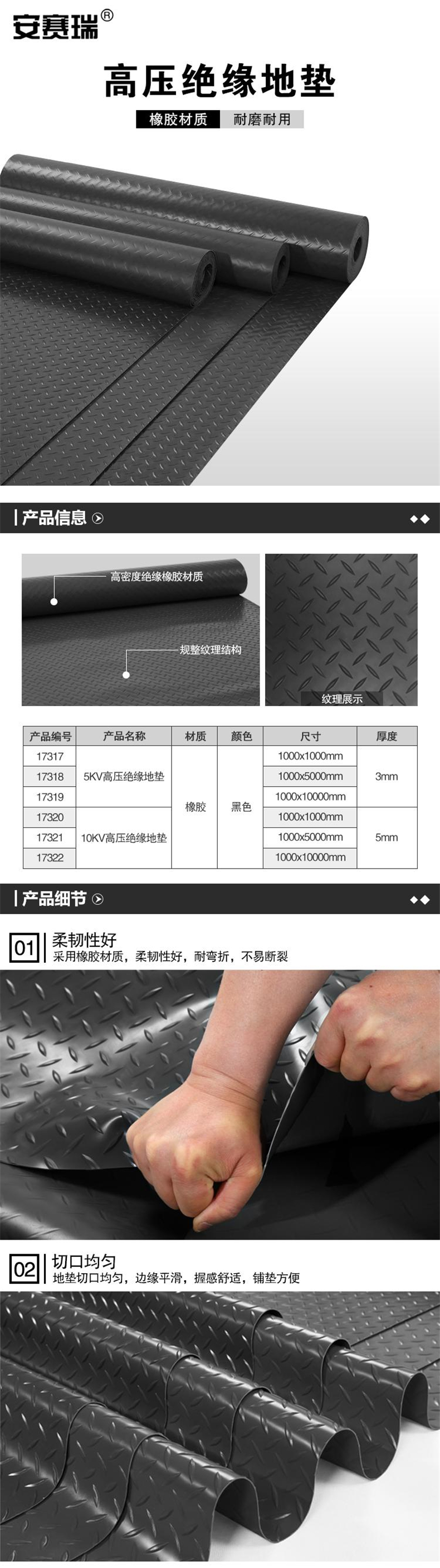 安赛瑞 17320 10KV高压绝缘地垫 (1×1m)1000*5000mm按(个)销售   收藏