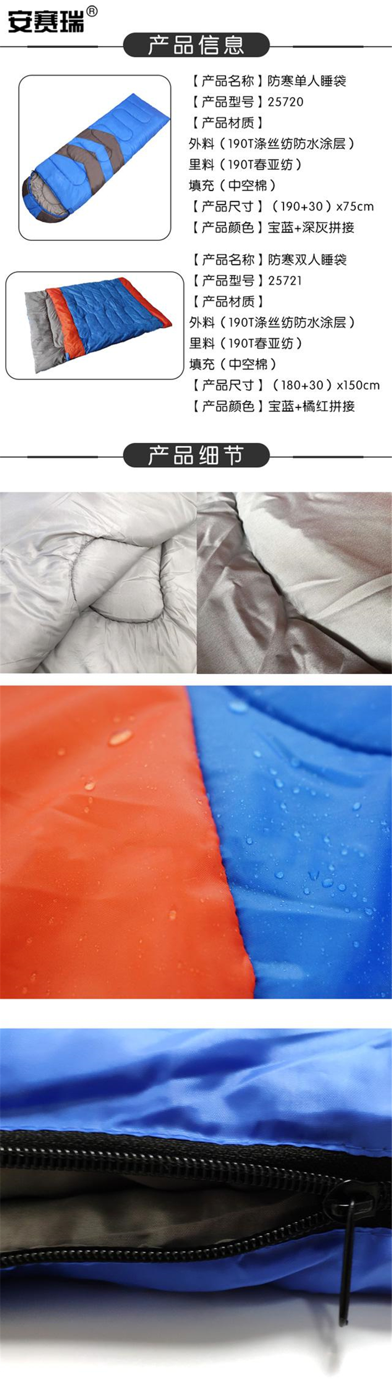 • 安赛瑞 25721 保暖双人睡袋 宝蓝/橘红拼接 2.8kg按(个)销售