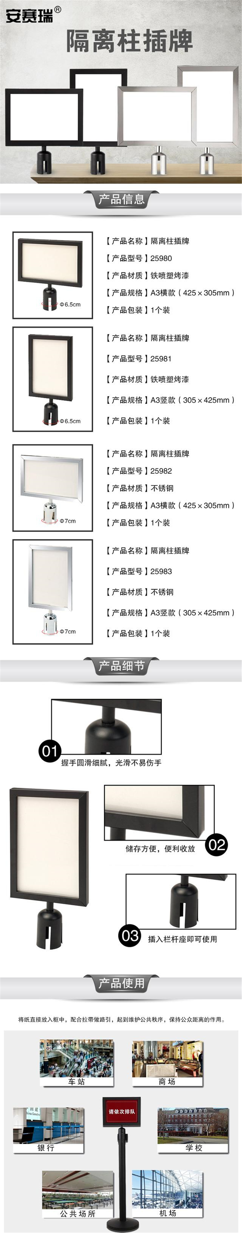 • 安赛瑞 25983 不锈钢隔离柱插牌 A3竖款按(个)销售