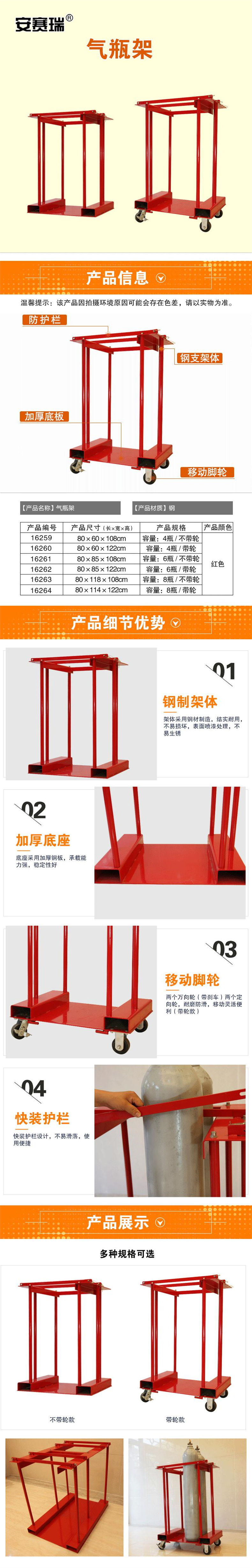 • 安赛瑞 16264 气瓶架 8瓶容量红色带刹车轮按(个)销售