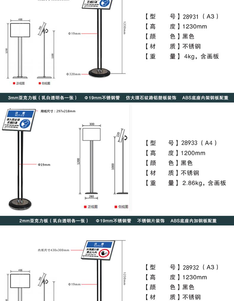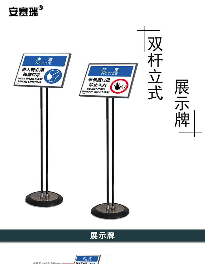 • 安赛瑞 28933 黑色双杆立式展示牌 注意 进入前必须佩戴口罩 A4横款立式按(个)销售
