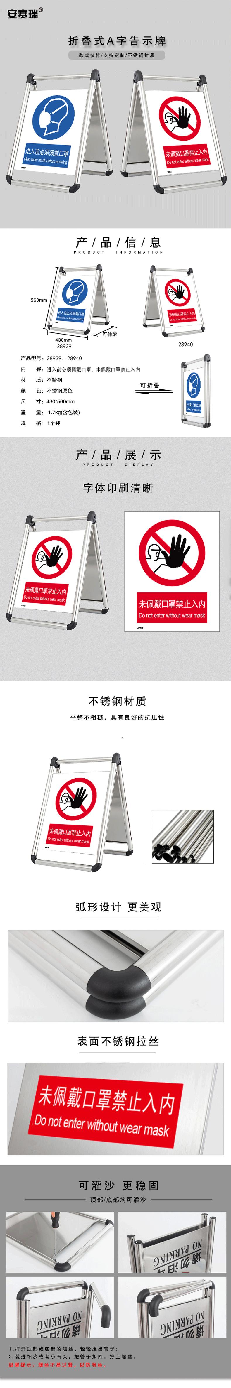• 安赛瑞 28939 折叠式不锈钢A字告示牌 (进入前必须佩戴口罩)按(个)销售