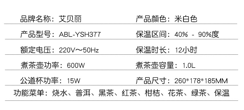 | 包装清单 | ABL-YSH377养生壶*1 说明书*1 |