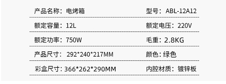 | 包装清单 | ABL-12A12电烤箱*1 说明书*1 |