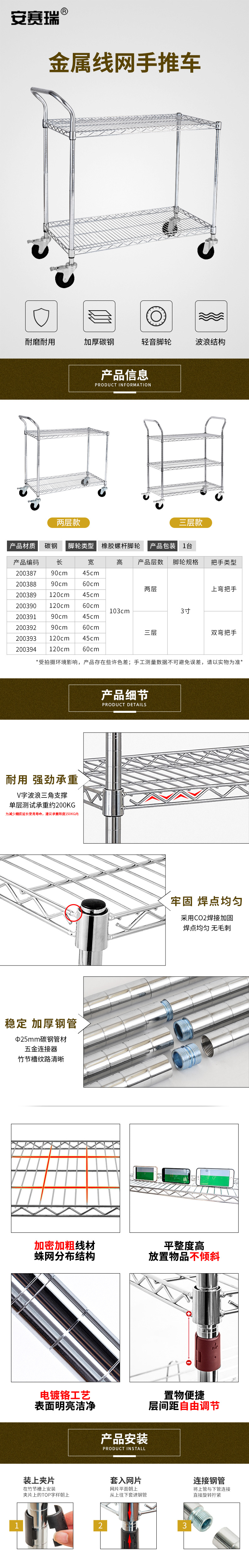 • 安赛瑞 200392 手推车 镀铬线网可移动搬运工具车 90×60×103cm 三层按(辆)销售
