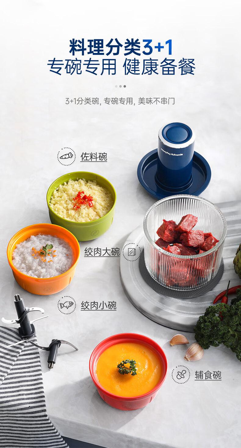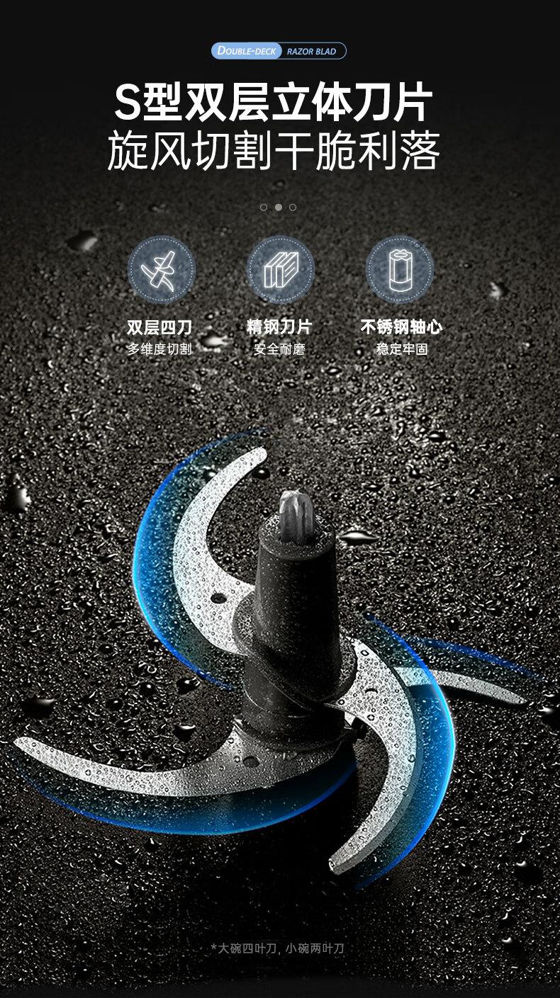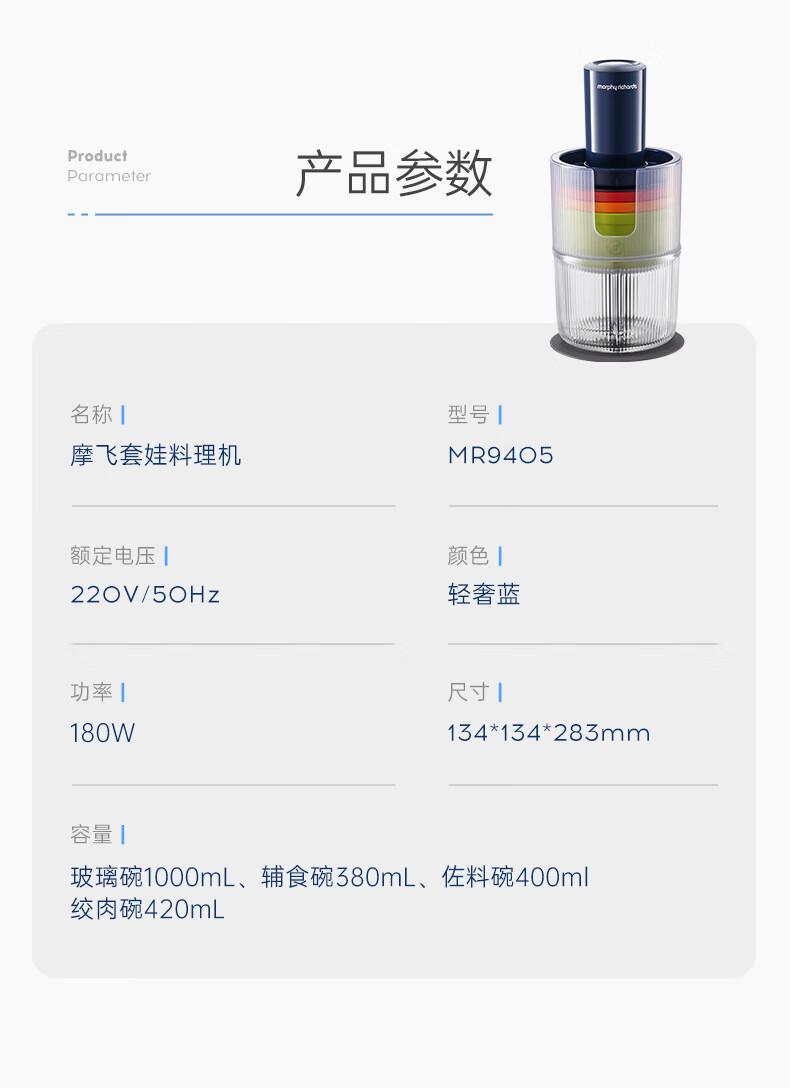| 包装清单 | 绞肉机*1、佐料碗*1、辅食碗*1、玻璃碗*1、绞肉碗*1、双叶刀头*1、四叶刀头*2 |