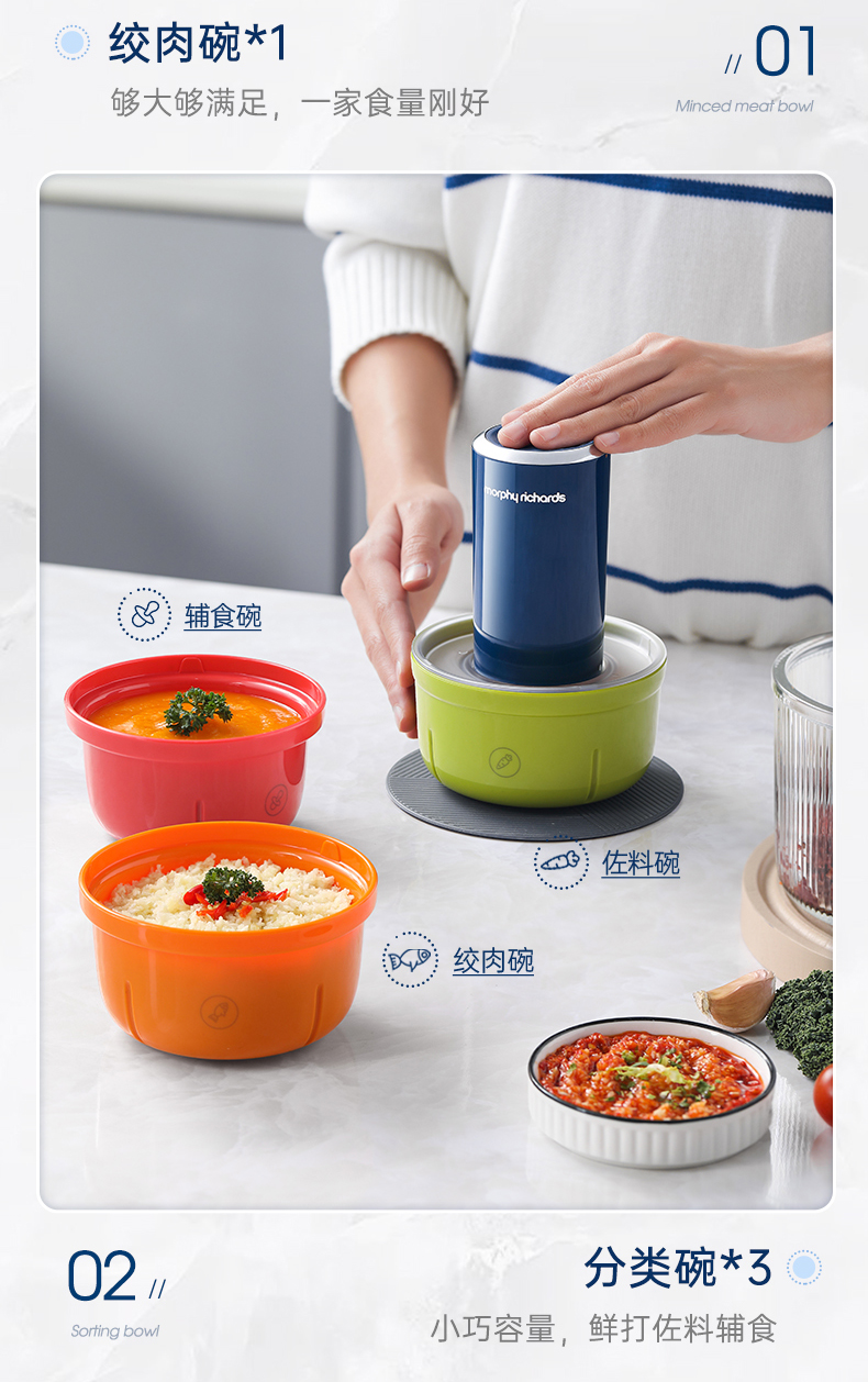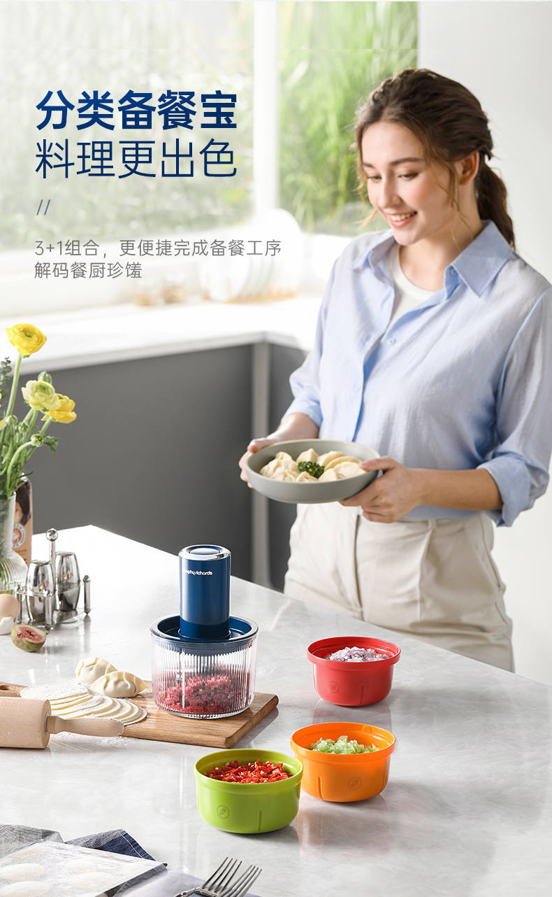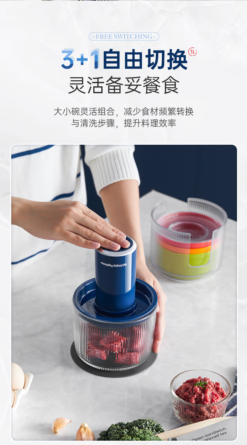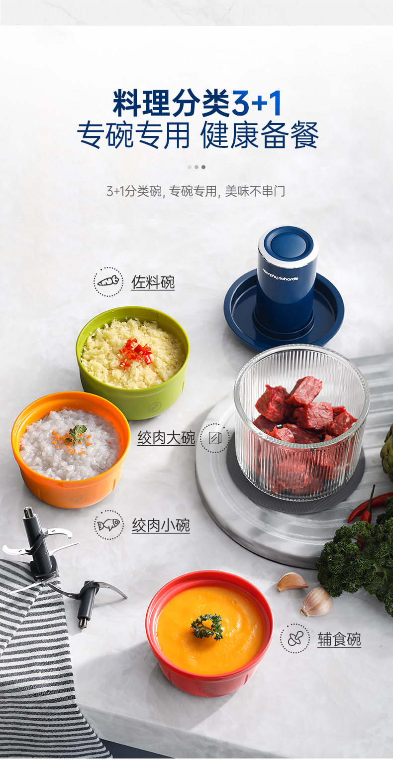 | 特色功能 | 1、四碗标配,健康分类;2、套娃设计,整机收纳;3、双刀配置,专配专用; 4、强劲动力,出料细腻;5、点动按压,随时掌控粗细; 6、透明玻璃碗,绞肉一目了然。 |