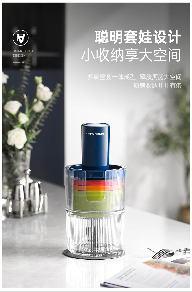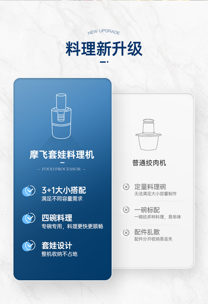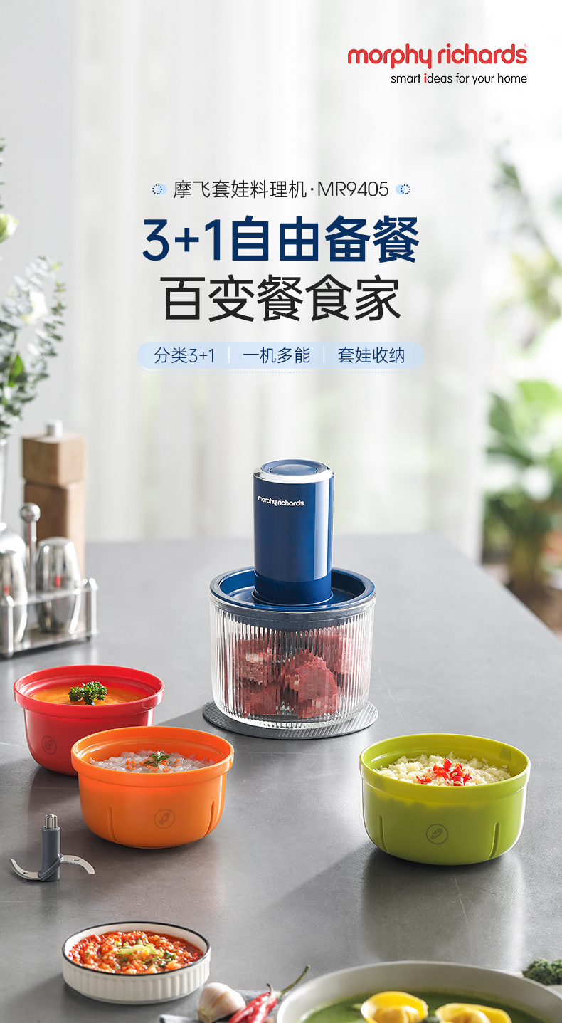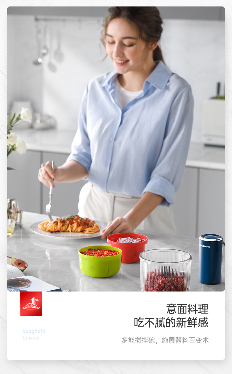 | 特色功能 | 1、四碗标配,健康分类;2、套娃设计,整机收纳;3、双刀配置,专配专用; 4、强劲动力,出料细腻;5、点动按压,随时掌控粗细; 6、透明玻璃碗,绞肉一目了然。 |