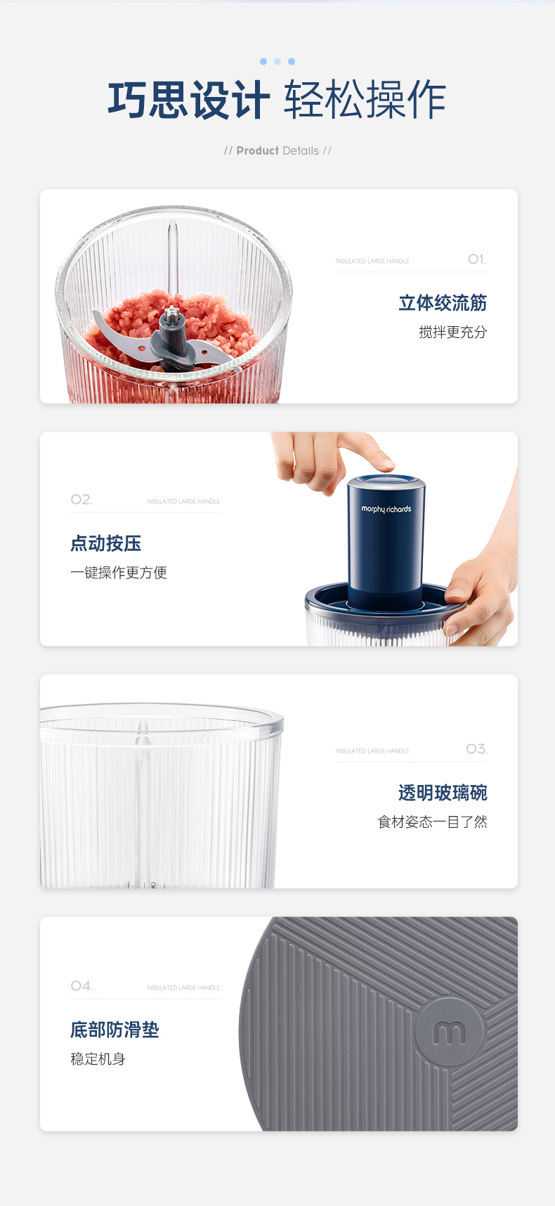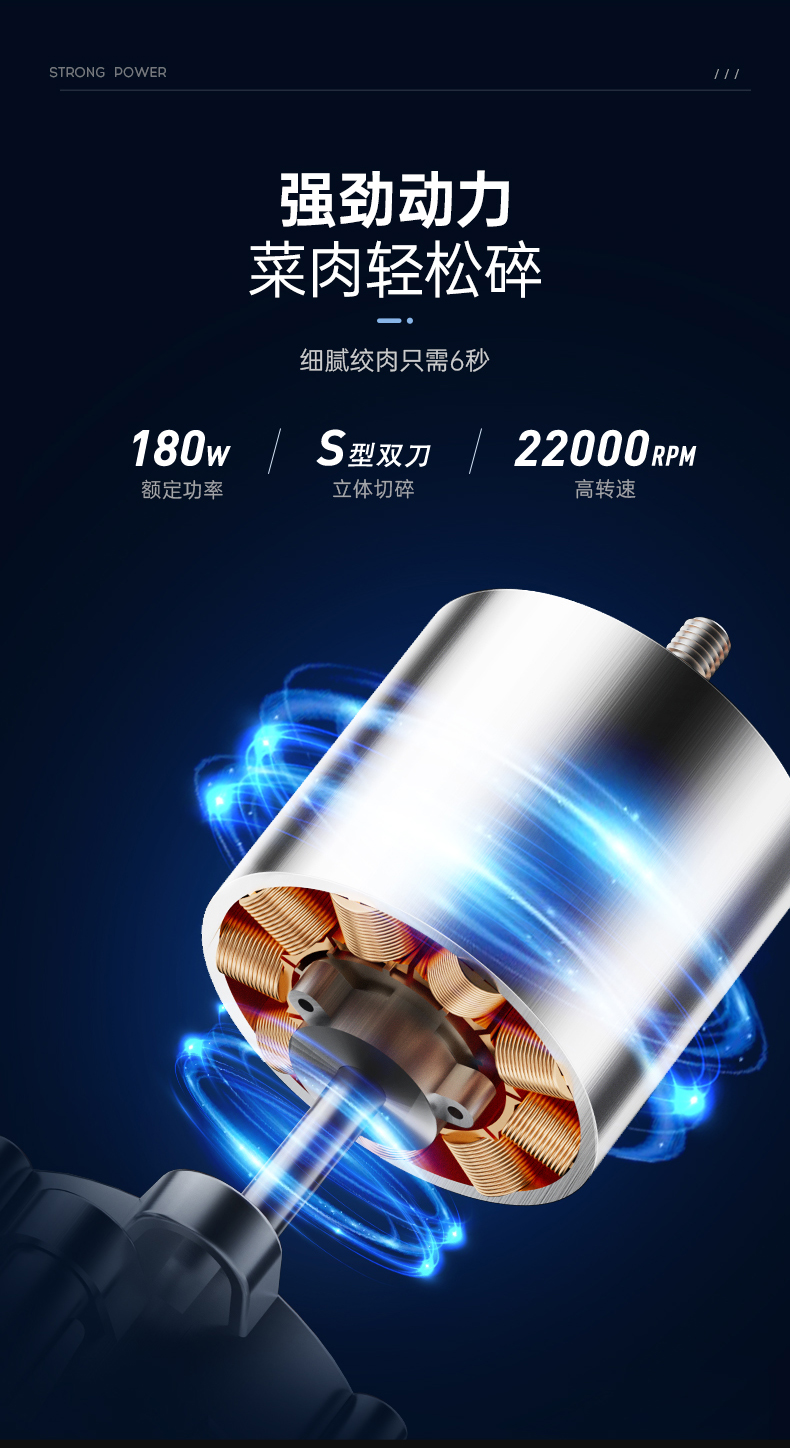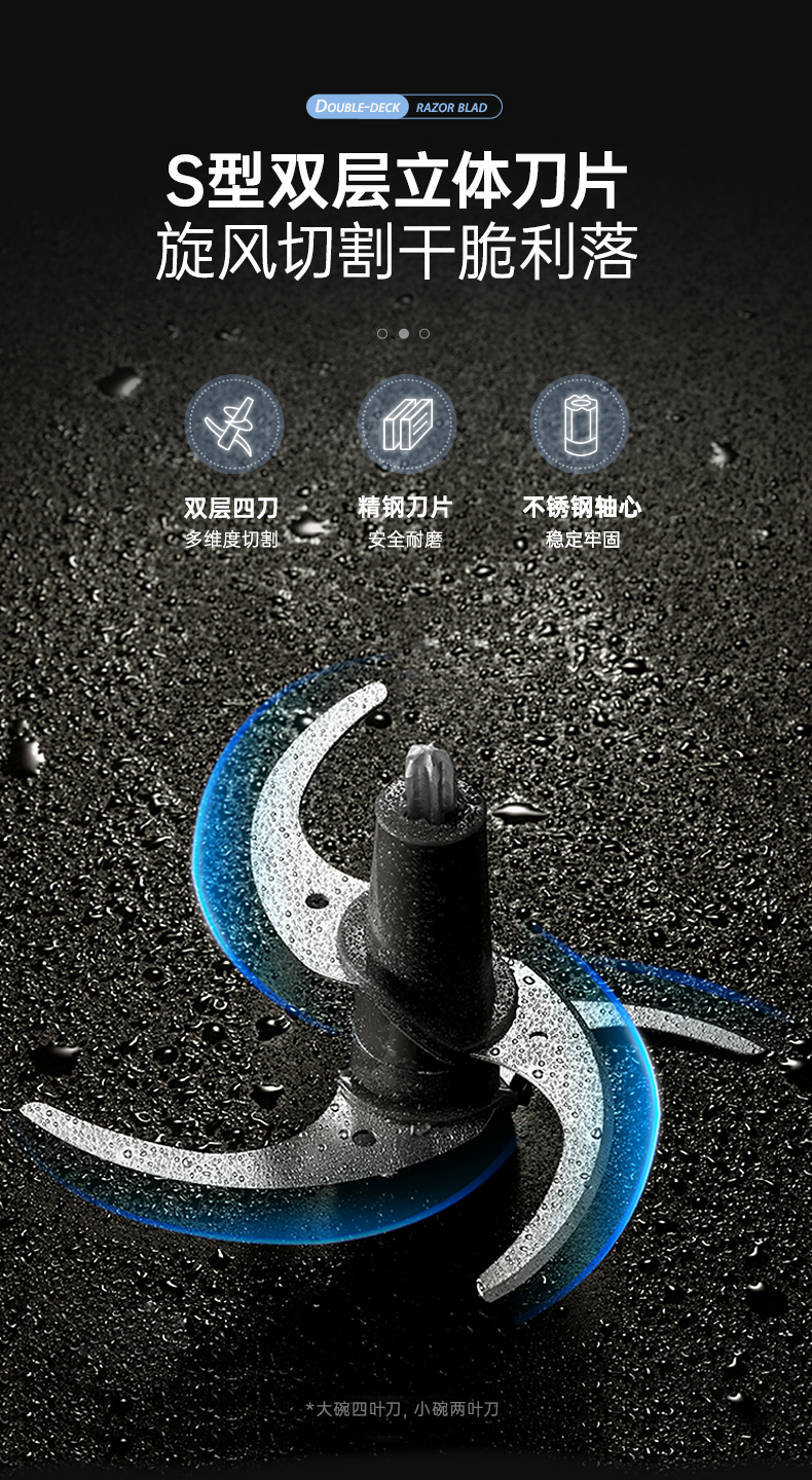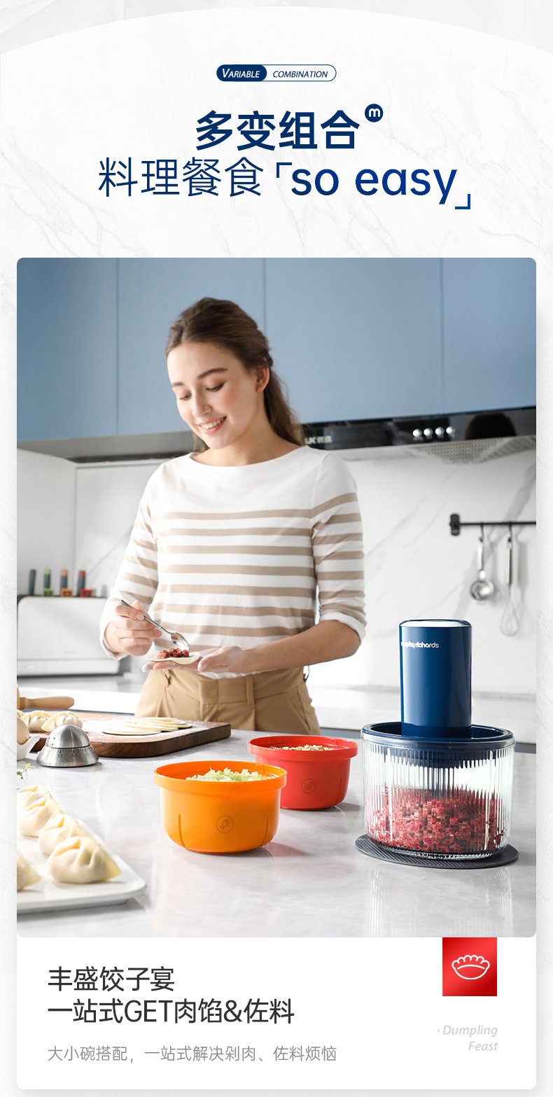 | 特色功能 | 1、四碗标配,健康分类;2、套娃设计,整机收纳;3、双刀配置,专配专用; 4、强劲动力,出料细腻;5、点动按压,随时掌控粗细; 6、透明玻璃碗,绞肉一目了然。 |