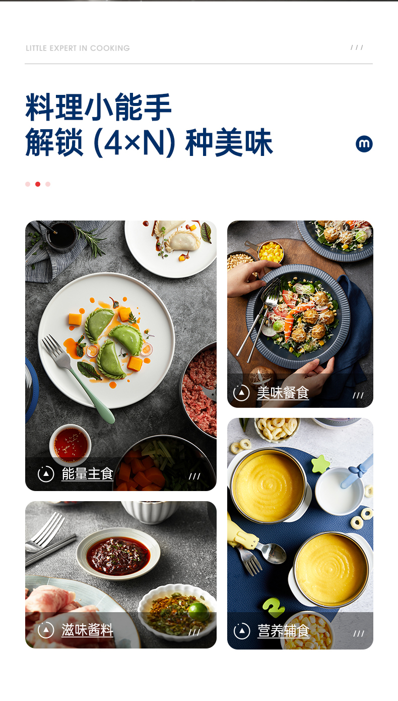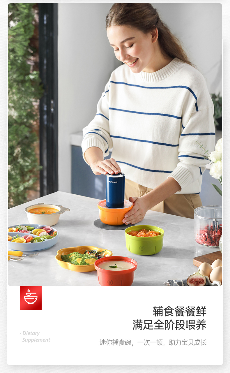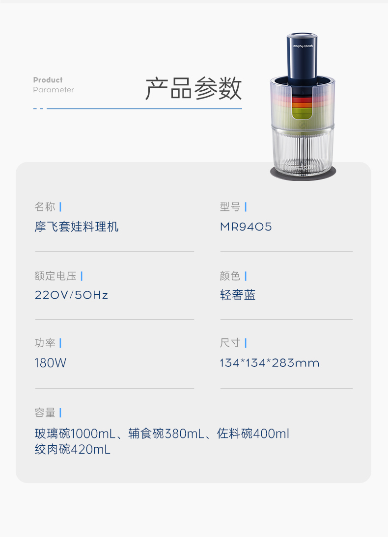 | 包装清单 | 主机*1、佐料碗*1、辅食碗*1、玻璃碗*1、绞肉碗*1、双叶刀头*1、四叶刀头*1 |
