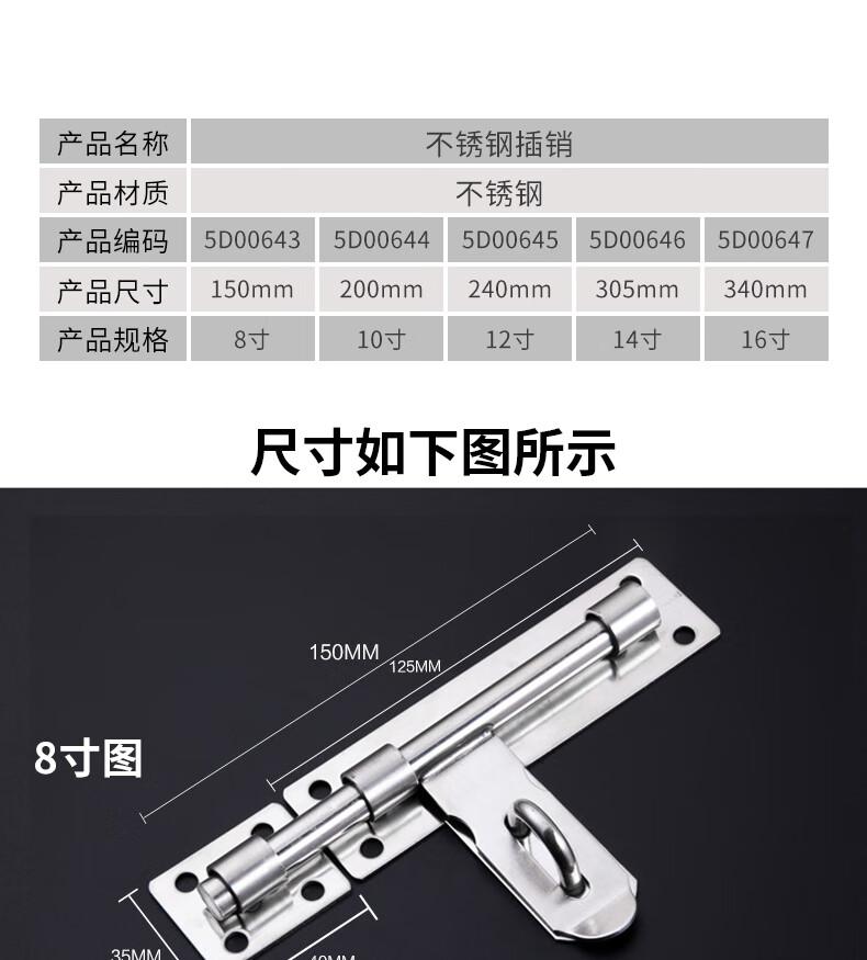 供应商:史泰博 品牌:安赛瑞 产地:中国 重量:0.000KG 销售单位:个 包装清单:不锈钢插销门栓 明装可挂锁老式门销*1