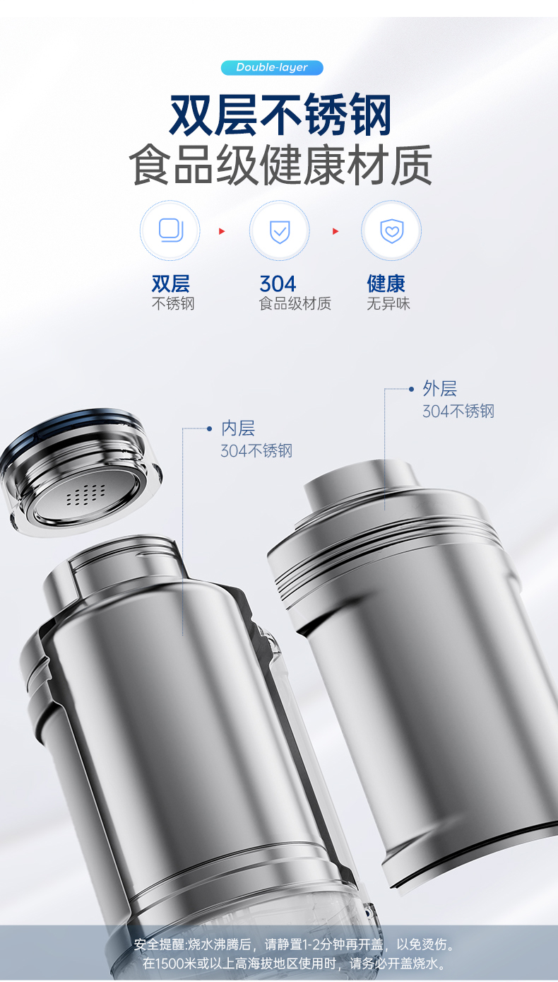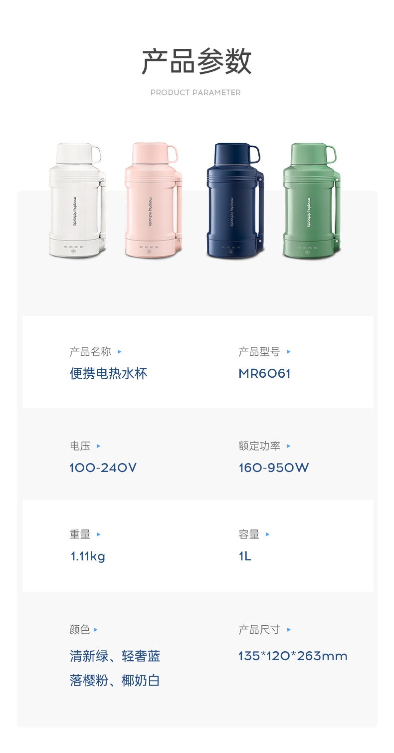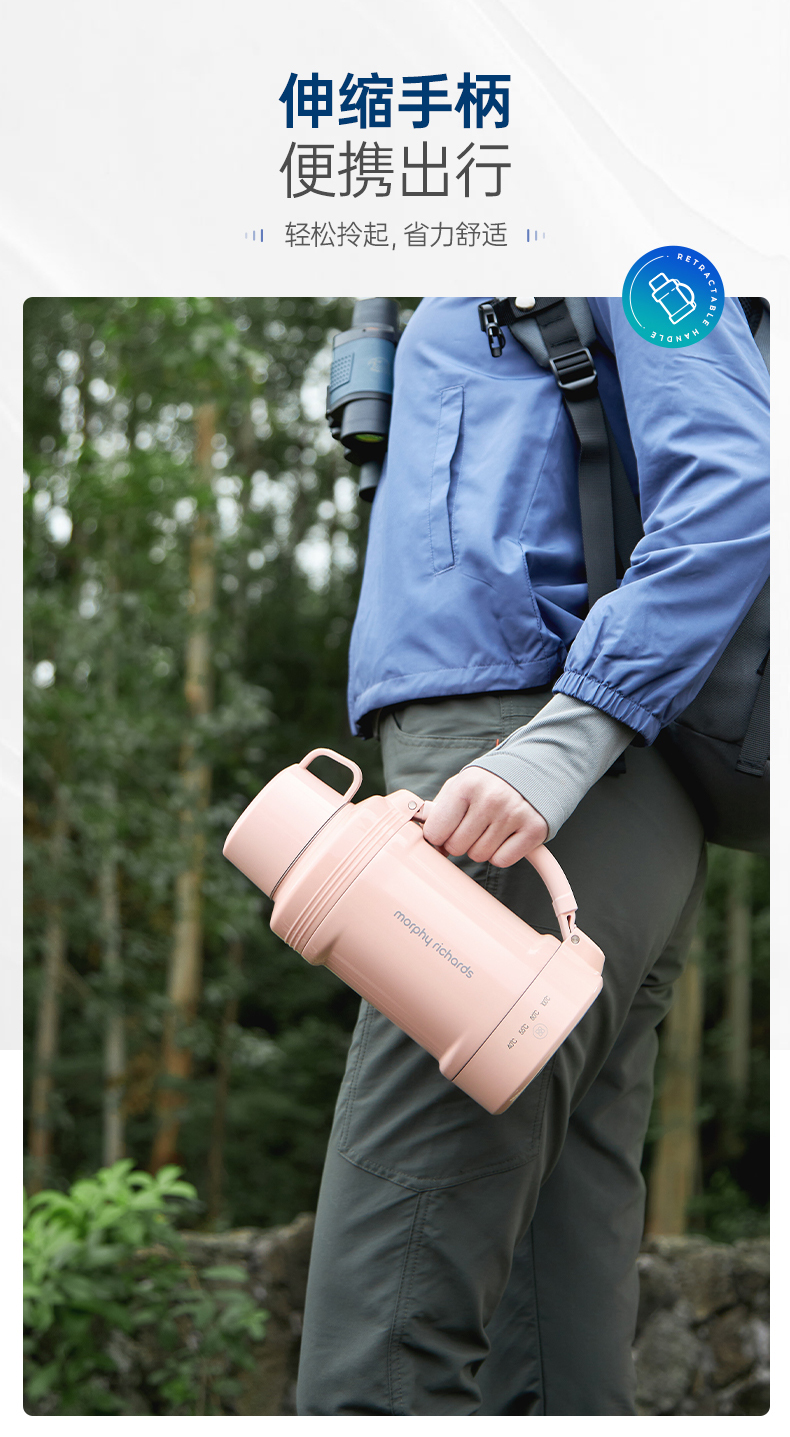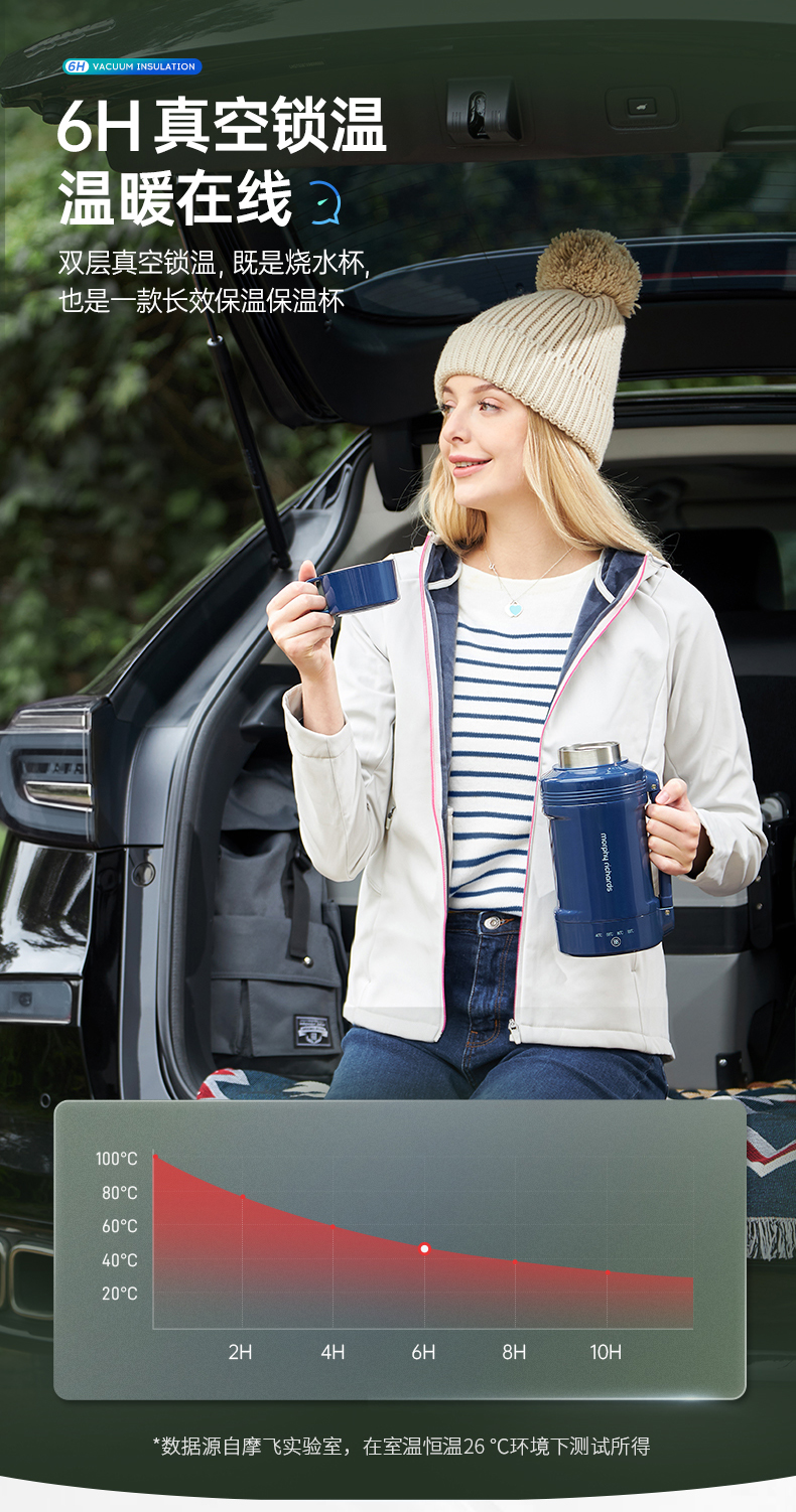 | 特色功能 | 1、伸缩手柄,舒适手感;2、双重密封,旅途不洒漏; 3、四档温度,一件调温; 4、一杯双盖,煮水喝水2in1; 5、双层不锈钢,健康材质; 6、真空保暖,6H持续温暖; 7、1L大容量,随享热水;8、关盖烧水,安全密封。 |