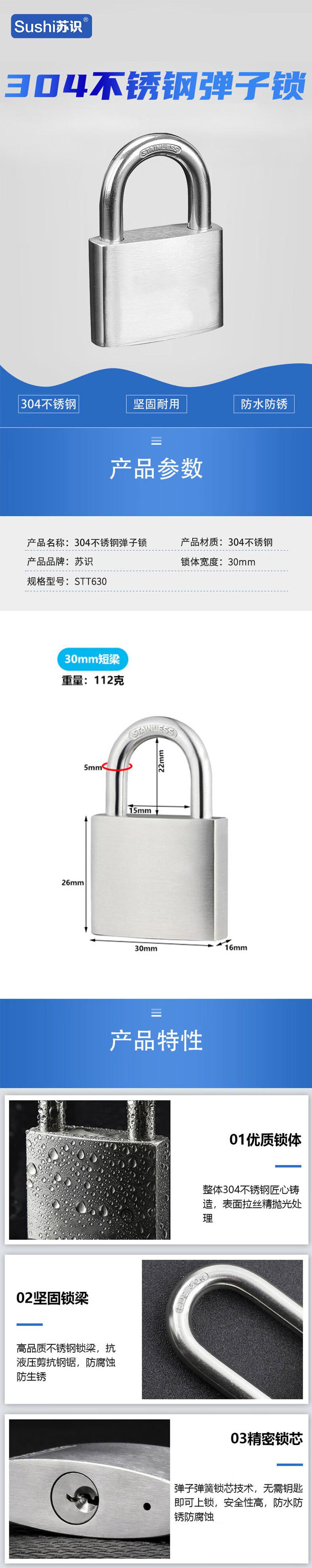 苏识 1610804 短梁304不锈钢弹子锁挂锁 STT630 银色按(个)销售   收藏