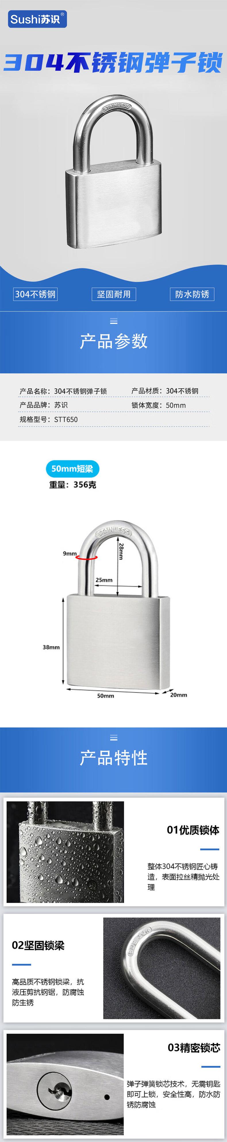 苏识 1610806 短梁304不锈钢弹子锁挂锁 STT650 银色按(个)销售   收藏