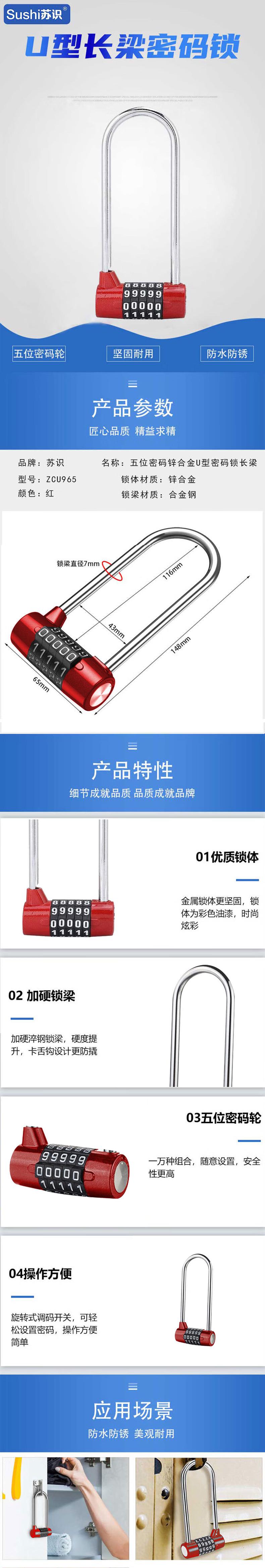 苏识 1670122 五位密码锌合金U型密码锁长梁 ZCU965红按(个)销售   收藏