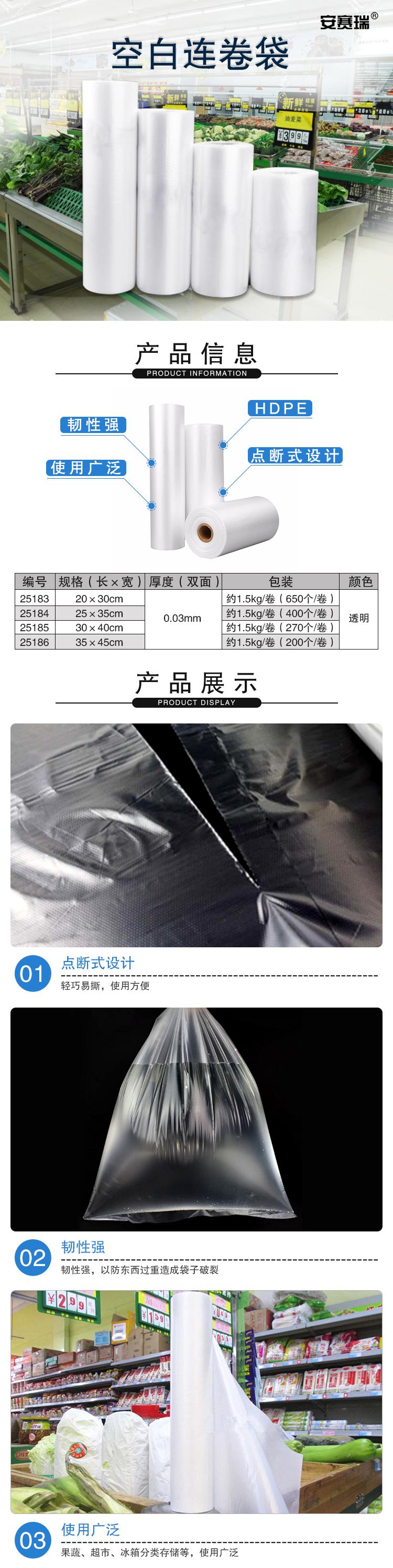 安赛瑞 25184 超市连卷袋 加厚保鲜袋 点断式 分装袋 25×35cm(400个装)按(卷)销售   收藏