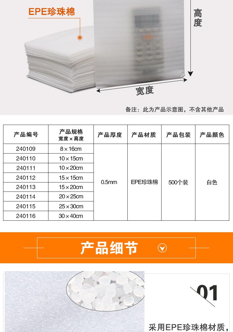 安赛瑞 240114 珍珠棉袋 防震泡沫包装袋 EPE包装袋 20×25cm(500个装)按(包)销售   收藏