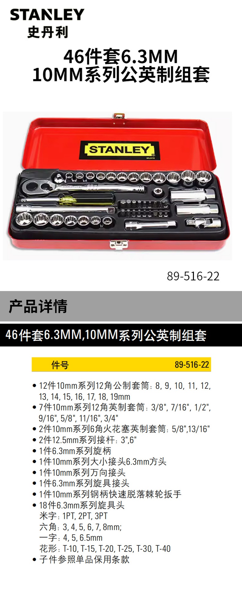 • 史丹利 89-516-22 46件套6.3MM,10MM系列公英制组套按(套)销售