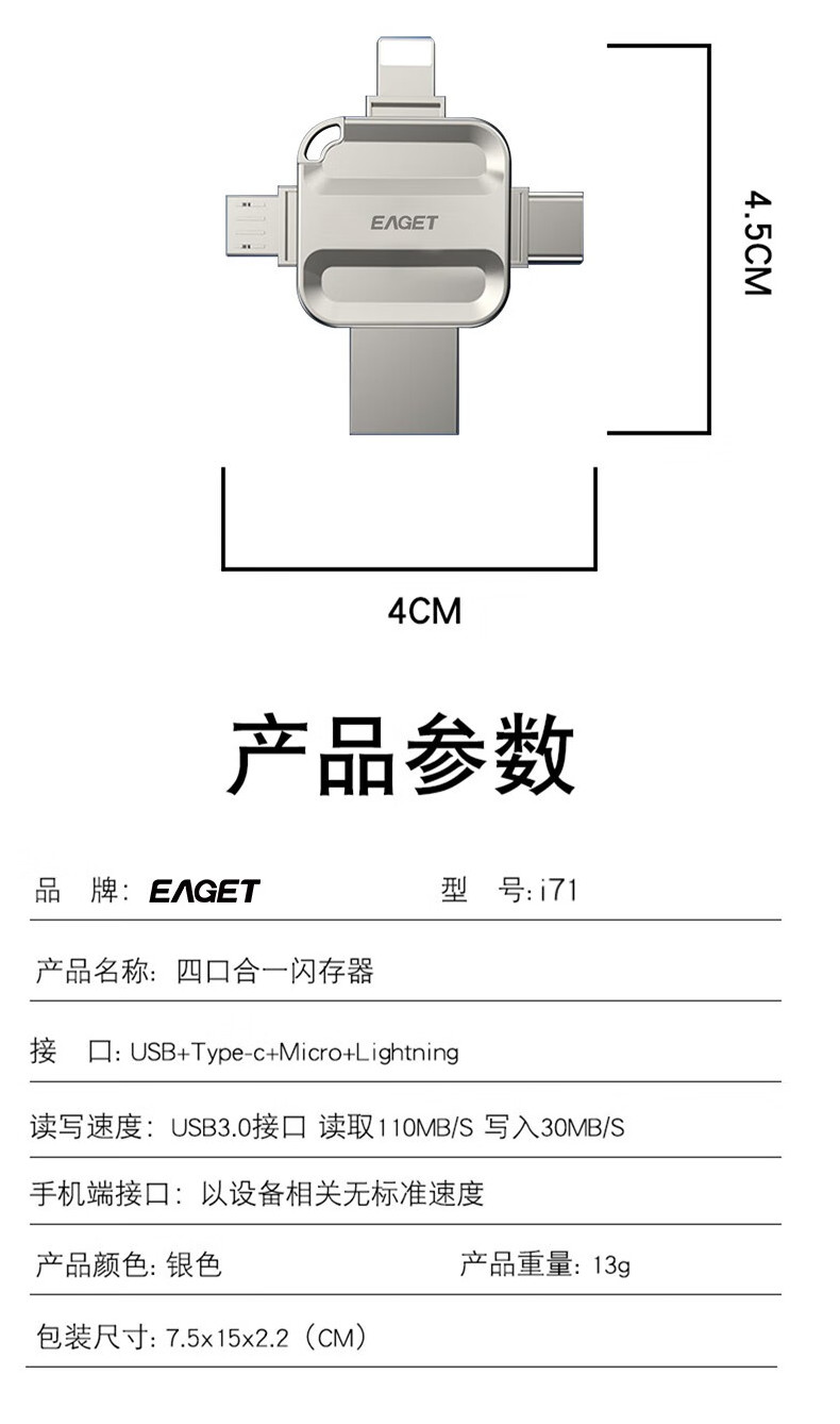 | 其他特性 | 四合一苹果安卓华为手机电脑通用四接口存储 |