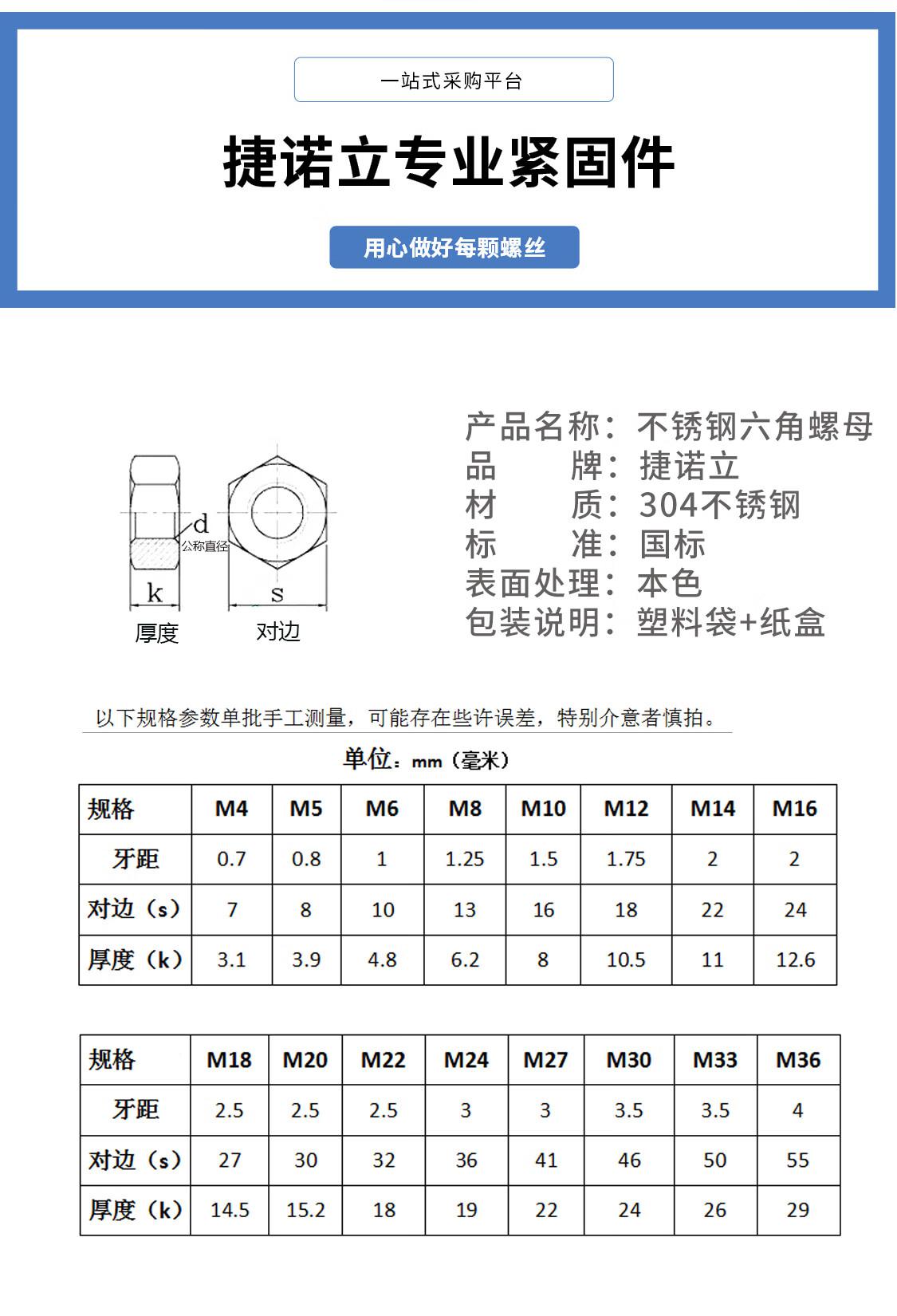 • 捷诺立 55621 304不锈钢螺母外六角螺母六角螺帽螺丝帽 M4(300只装)按(包)销售