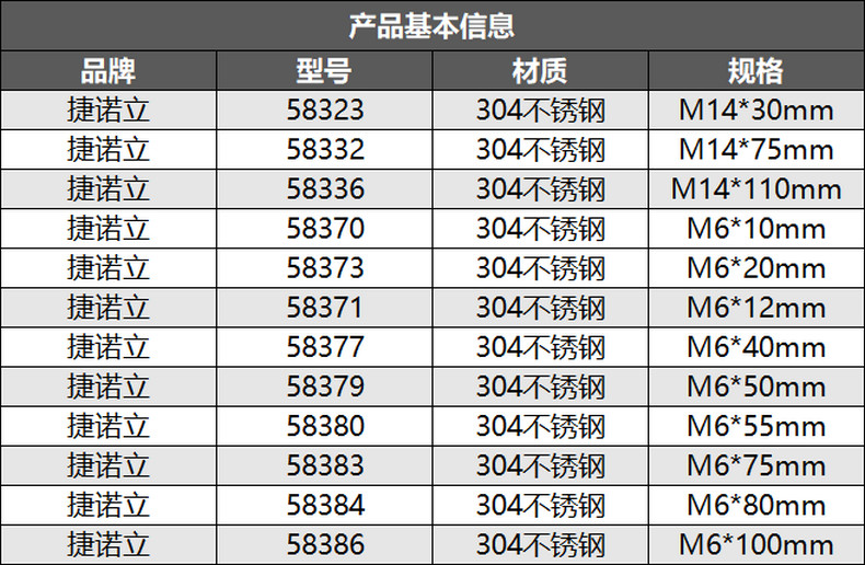 • 捷诺立 58384 304不锈钢外六角螺丝螺栓螺母平垫弹垫套装 M6*80mm(30套)按(包)销售