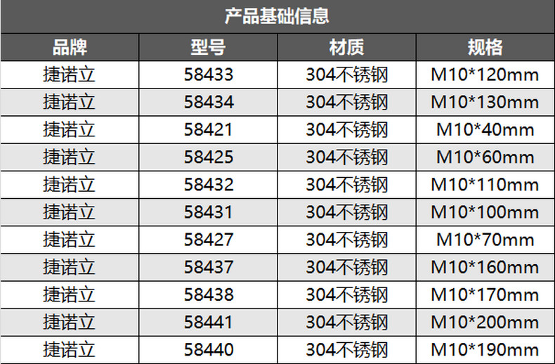 • 捷诺立 58433 304不锈钢外六角螺丝螺栓螺母平垫弹垫套装 M10*120mm(10套)按(包)销售