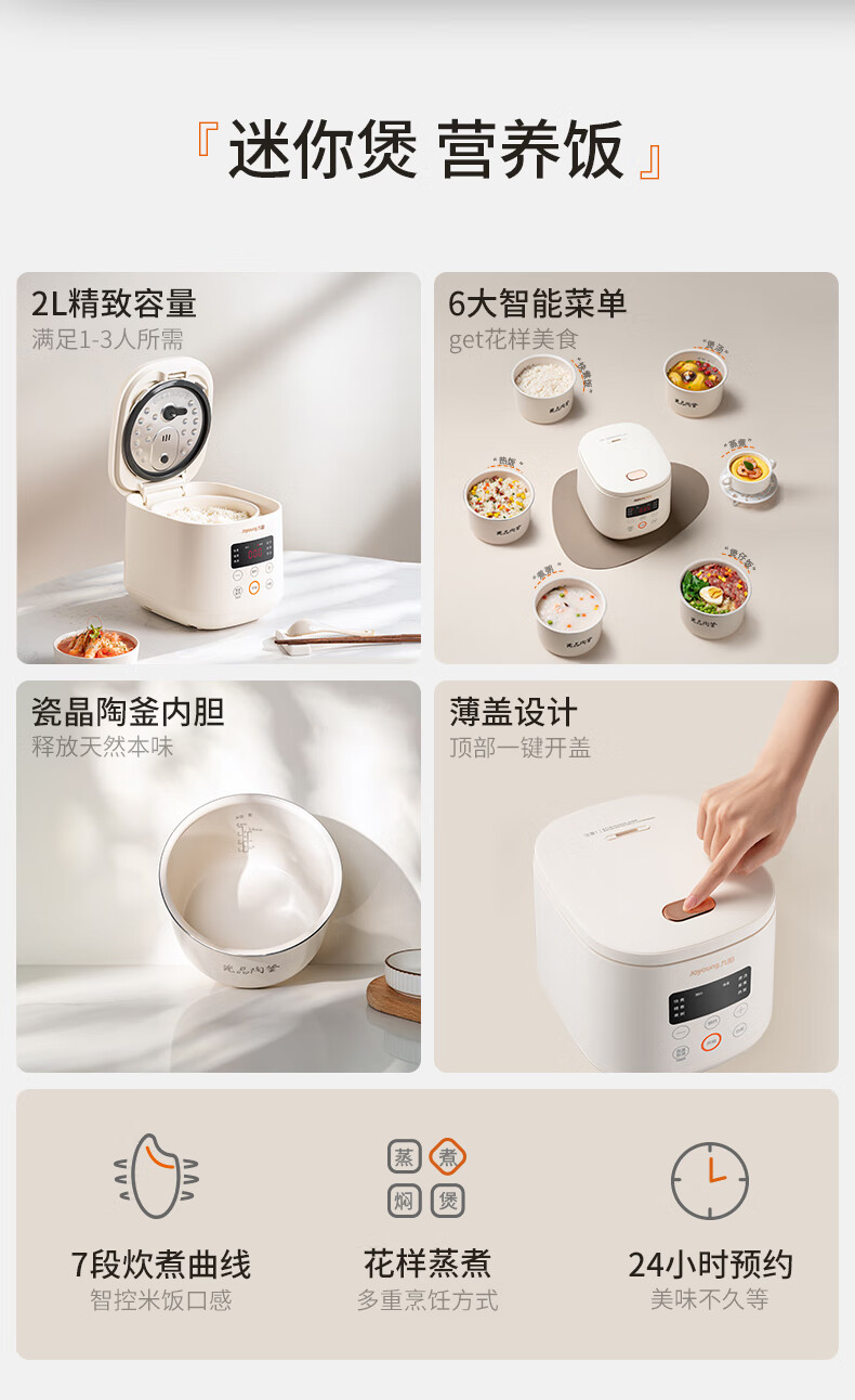 | 特色功能 | 1、2L精致容量;2、前置6大菜单;3、陶瓷油内胆 |