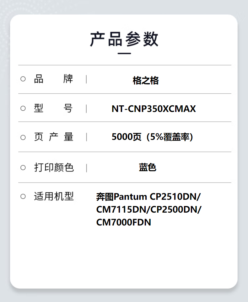 • 格之格 NT-CNP350XCMAX 碳粉盒 5000页 蓝色 适用于Pantum CP2510DN/CM7115DN/CP2500DN/CM7000FDN按(支)销售