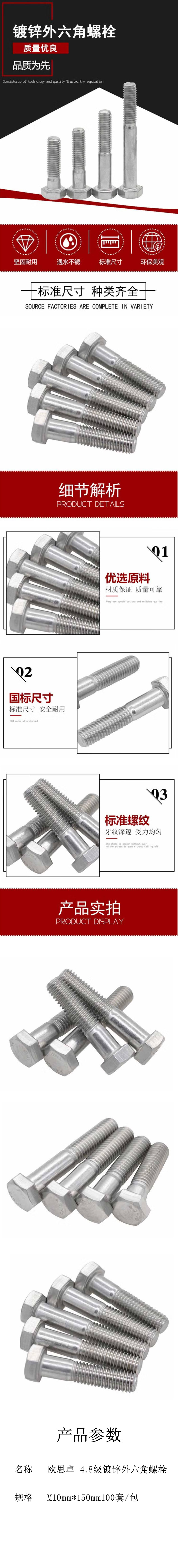 欧思卓 4.8级镀锌外六角螺栓 M10mm*150mm 100套/包按(包)销售   收藏