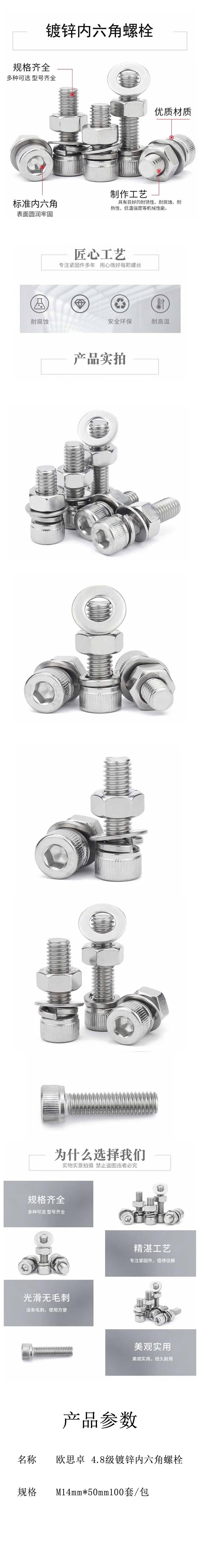 欧思卓 M14mm*50mm 4.8级镀锌内六角螺栓 100套/包按(包)销售   收藏