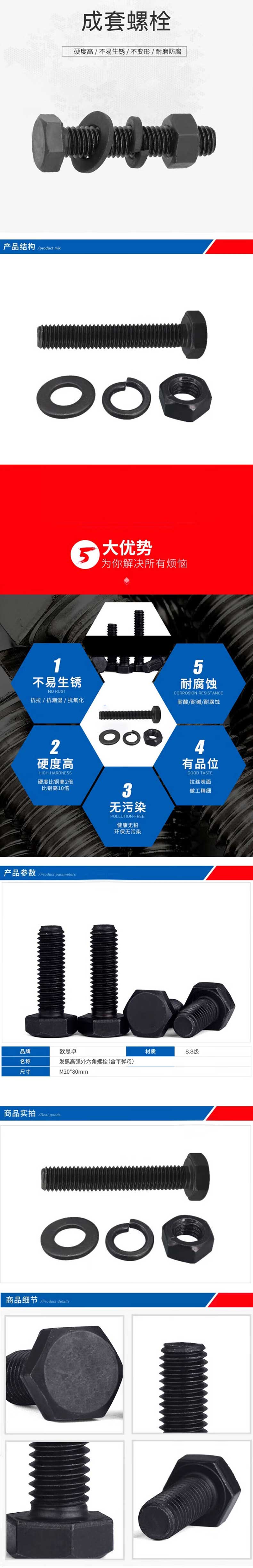 供应商:史泰博 品牌:欧思卓 产地:中国 销售单位:套 包装清单:8.8级发黑高强外六角螺栓(含平弹母)*1