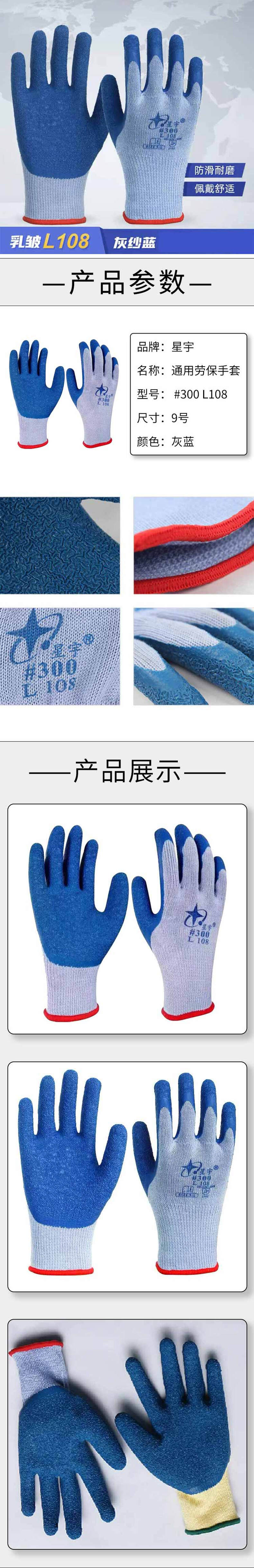 • 星宇 L108 通用劳保手套  浸胶乳胶耐磨防滑 #300 9号 灰蓝 12副/包按(包)销售