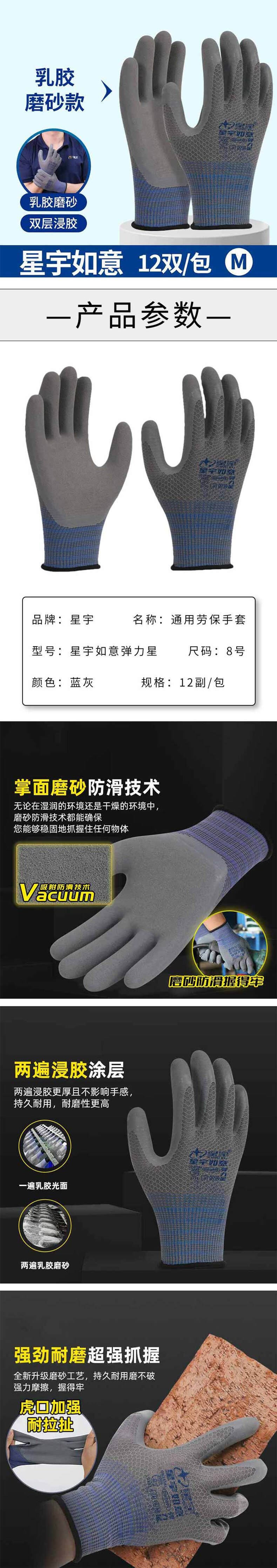 • 星宇 通用劳保手套 12副/包  橡胶防滑丁腈胶皮薄款透气通用 星宇如意弹力星 8号 蓝灰按(包)销售