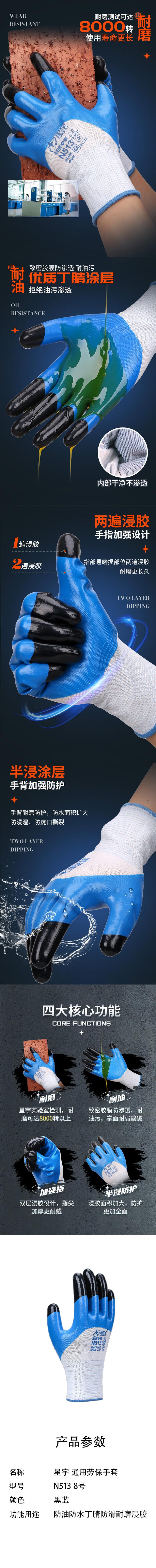 星宇 N513 通用劳保手套 防油防水丁腈防滑耐磨浸胶 8号 黑蓝 12副/包按(包)销售   收藏