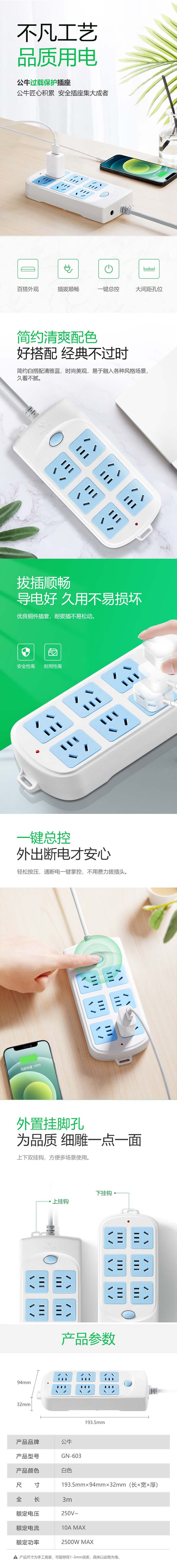 • 公牛 GN-603 排插  插线板/插排/接线板/拖线板 总控 6位 3米 白蓝 1个/包按(个)销售