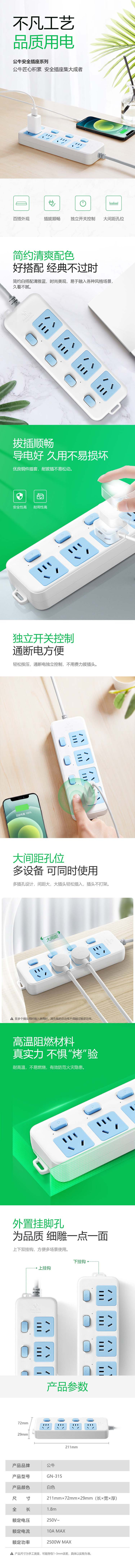 • 公牛 GN-315 排插  插线板/插排/接线板/拖线板 分控 4位 1.8米 白蓝 1个/包按(个)销售