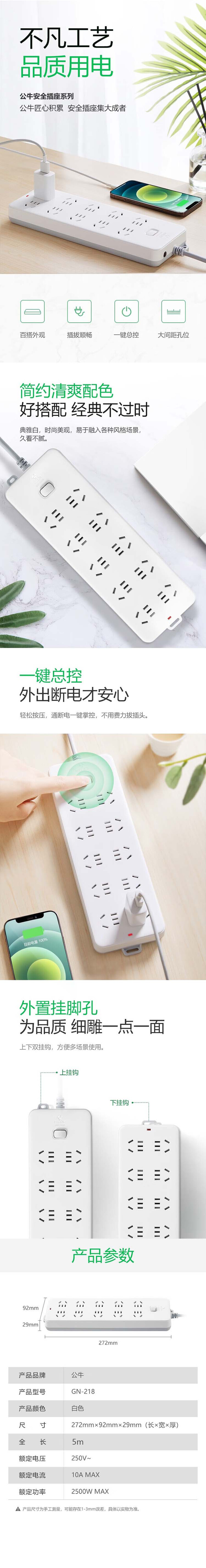 • 公牛 GN-218 排插  插线板/插排/接线板/拖线板 总控 10位 5米 白色 1个/包按(个)销售