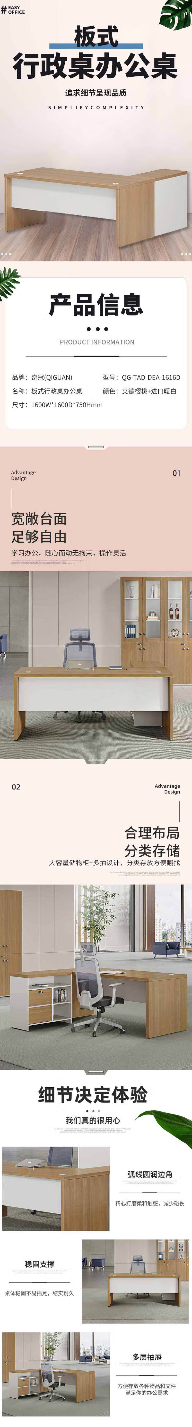 • 奇冠 QG-TAD-DEA-1616D 板式行政桌办公桌  1600W*1600D*750Hmm 艾德樱桃+进口暖白按(张)销售