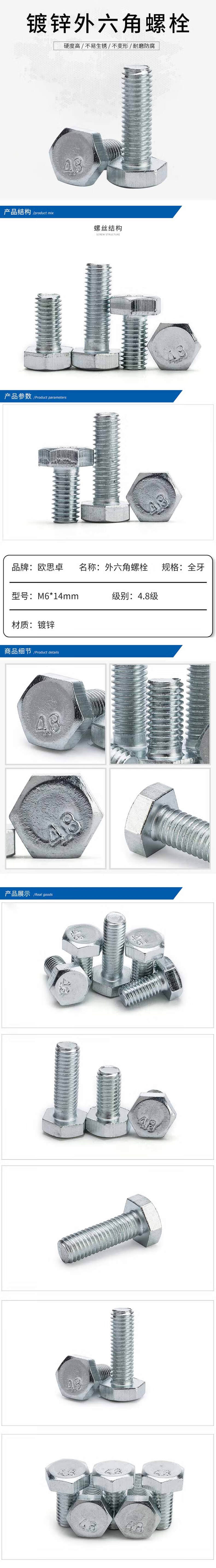 欧思卓 M6*14mm 外六角螺栓 4.8级GB/T 5781 全牙 镀锌 100个/包按(包)销售   收藏