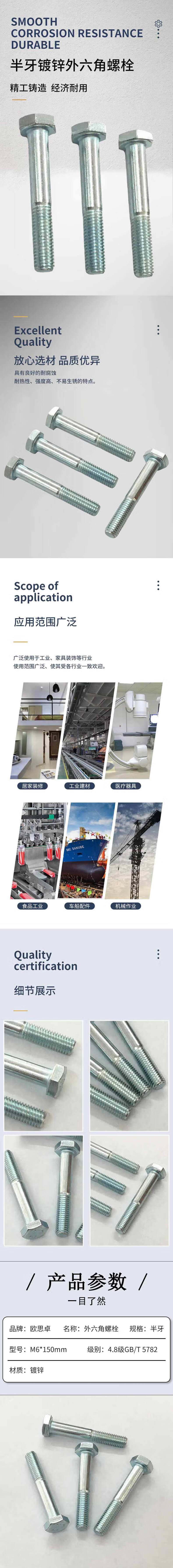 • 欧思卓 M6*150mm 外六角螺栓  4.8级GB/T 5782 半牙 镀锌 100个/包按(包)销售