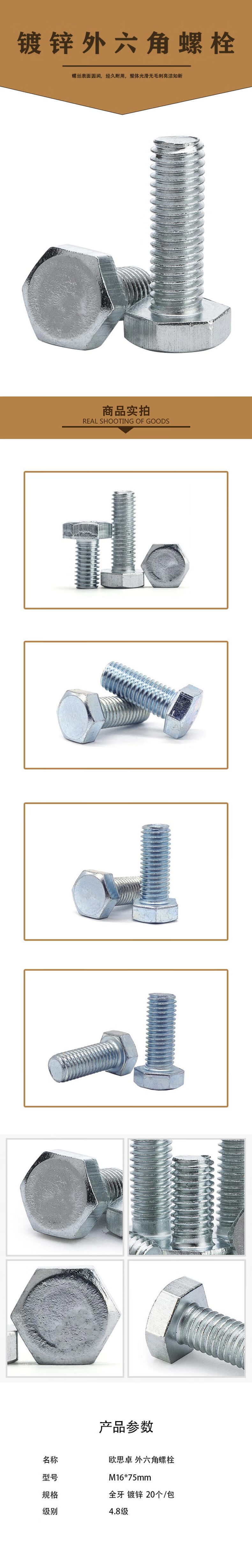 • 欧思卓 M16*75mm 外六角螺栓  4.8级GB/T 5781 全牙 镀锌 20个/包按(包)销售