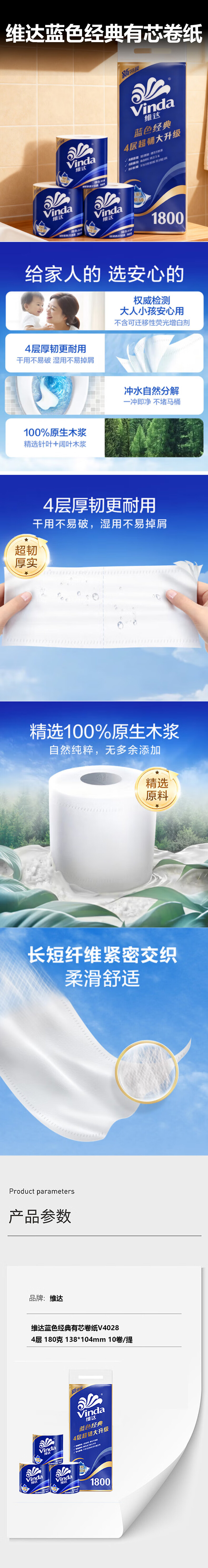 维达 V4028 有芯卷纸 蓝色经典4层 180克 138*104mm 10卷/提按(提)销售   收藏
