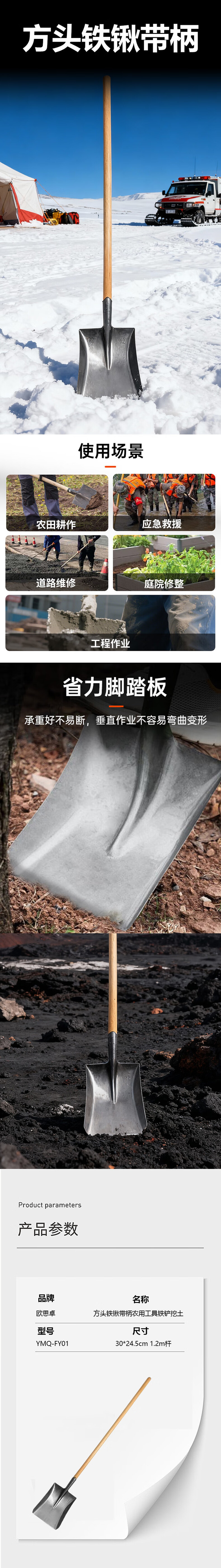 • 欧思卓 YMQ-FY01 方头铁锹  30*24.5cm 1.2m杆 中号 本色 个按(个)销售