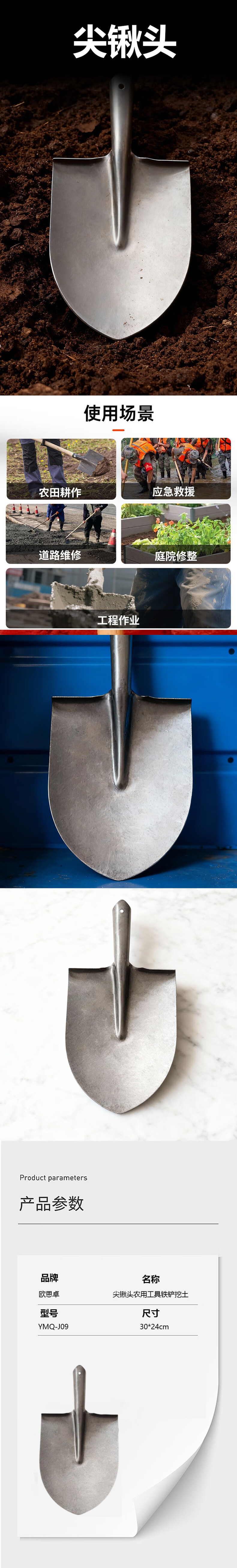 • 欧思卓 YMQ-J09 尖锹头  农用工具铁铲挖土 30*24cm 中号 本色 个按(个)销售